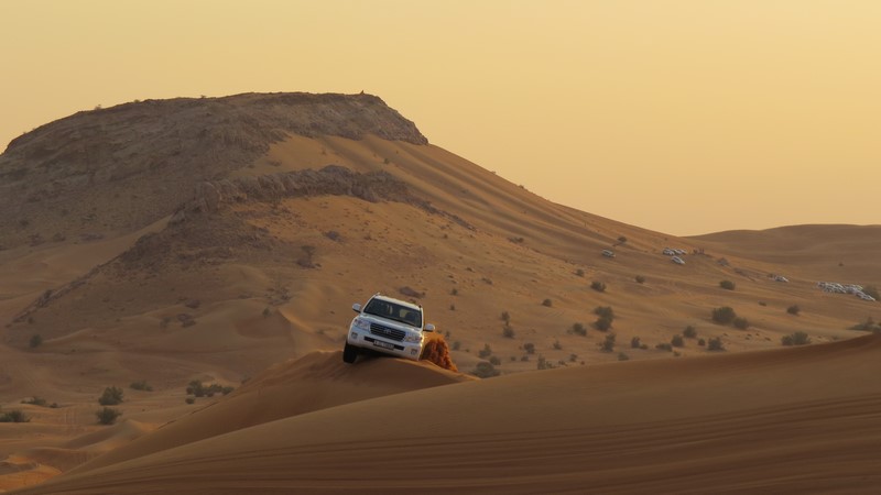 Le chauffeur vient vous chercher à votre hôtel et après 1H30 de trajet, vous rejoignez une station-services, où d’autres 4×4 sont déjà présents. Là, votre chauffeur dégonflera les pneus de la voiture… Mais pourquoi ? Et bien, juste après, vous quittez l’autoroute en direction des dunes de sable ! Ça commence doucement, mais au fur-et-à-mesure que l’on s’enfonce dans le désert, les dunes sont de plus en plus hautes et la voiture glisse énormément. Là, votre chauffeur fonce à toute vitesse sur l’océan de sable : frissons et fous rires garantis.