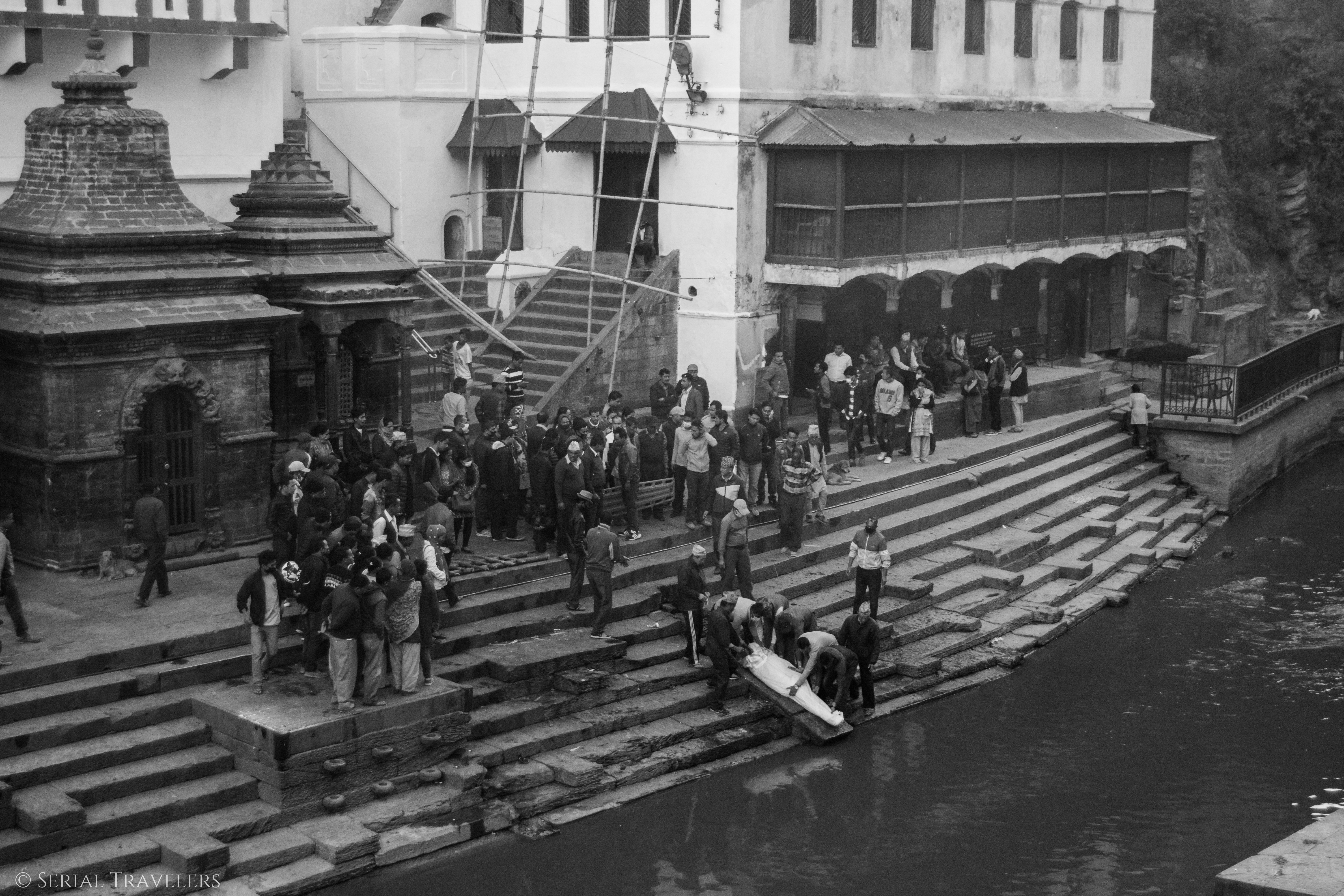 Quand soudain, une cinquantaine de personnes s’avancent vers le ghat de purification situé en amont de la rivière. Au milieu de la foule, des hommes portent un corps embaumé dans un linceul blanc ou orange, en fonction de l’âge du défunt (orange signifiant qu’il s’agit d’une personne âgée). Ils le déposeront au bord du ghat et le purifiront en lui versant de l’eau de la rivière Bagmati.