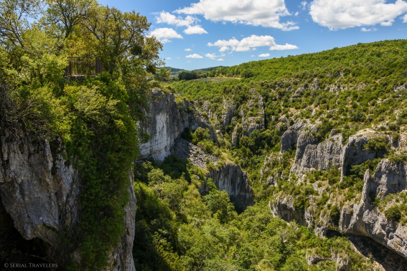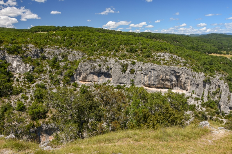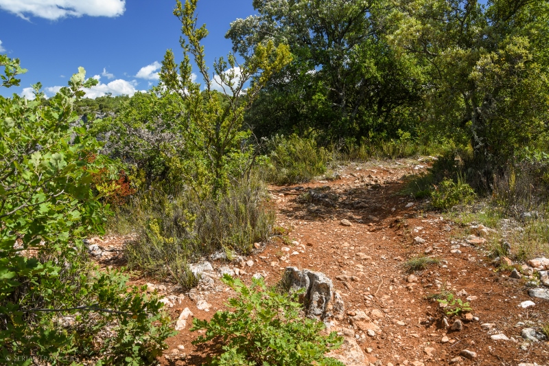 Les deux autres sentiers étant beaucoup trop difficiles et non adaptés aux familles, nous opterons pour le sentier des Terres du Four, qui permet de longer la rive orientale du canyon après un passage ombragé à travers la garrigue. La randonnée, très facile grâce à la quasi absence de dénivelé, permet de s’approcher au plus près du bord de la falaise, en évoluant sur un chemin de terre, au milieu des chênes.