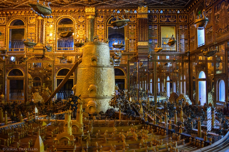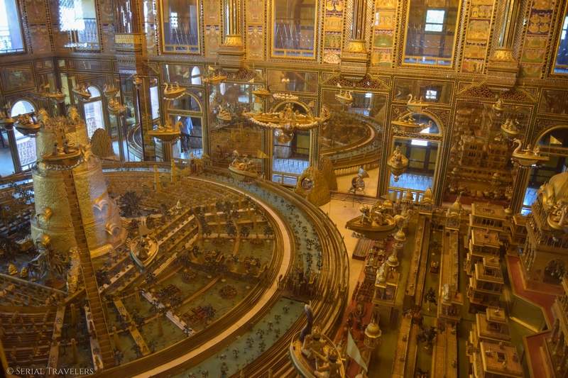 Apparemment, ce sont près de 1000 kg d’or qui furent utilisés pour recouvrir l’ensemble ! Dans une grande pièce visible au travers de vitres, nous découvrons un monde constitué de petits personnages, de bâtiments et de mobiles au plafond. Très chargé et pompeux, l’effet visuel est tout de même réussi et nous restons quelques minutes à parcourir tous les recoins de la salle du temple sur deux étages.