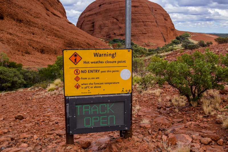 La randonnée commence par un sentier plutôt plat au milieu d’une plaine parsemée de Kurkara pour atteindre le point de vue Karu lookout. A partir de ce point, vous entrez réellement dans le dédale des dômes ! D’ailleurs, un panneau indicatif est là pour autorisé ou non la randonnée dans Kata Tjuta, en fonction des conditions météorologiques (fortes chaleurs notamment). Attention, si le panneau indique « TRACK CLOSED » et que vous prenez le risque de vous rendre sur le sentier, vous risquez de prendre une forte amende !