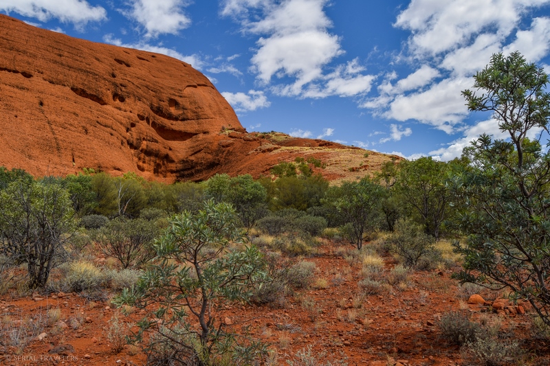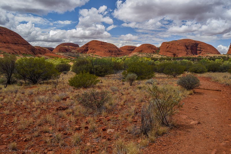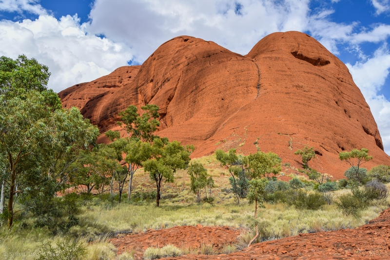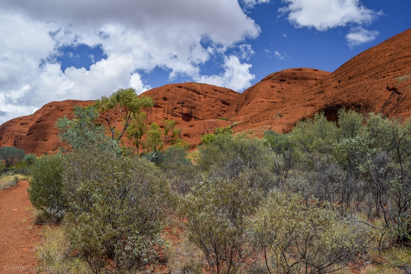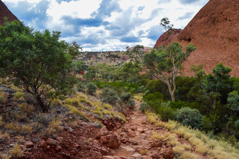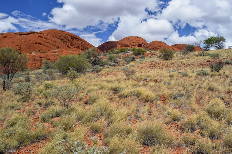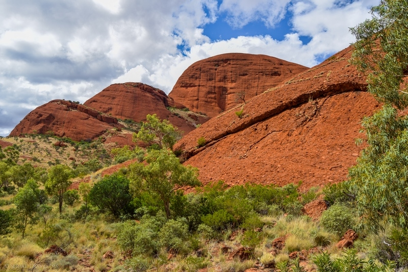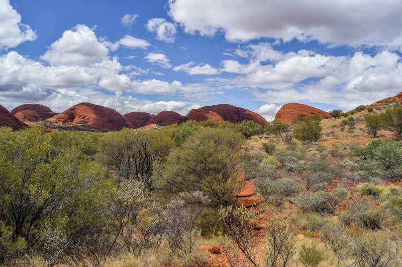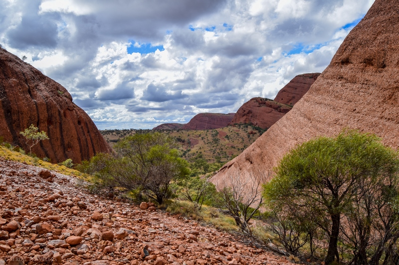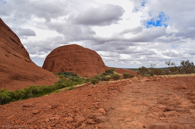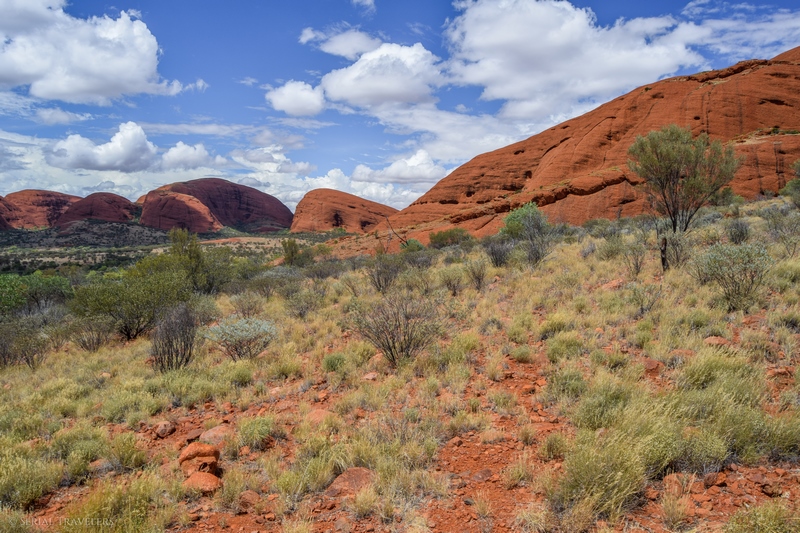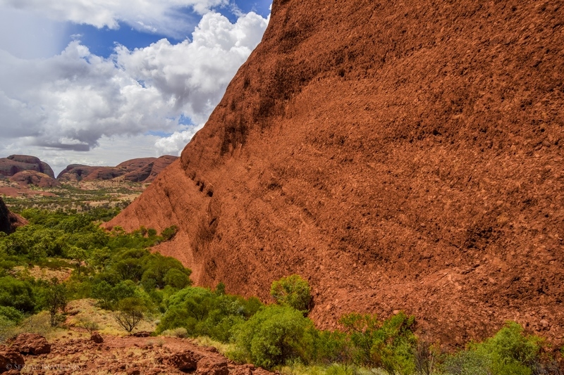 Suite au point de vue de Karingana Lookout, il faut de nouveau descendre une portion de sentier très raide, terminant au milieu d’herbes hautes et d’une végétation tellement dense qu’il ne sera pas facile d’avancer entre les buissons ! Puis, devant nous, s’étendent enfin à perte de vue les dômes ceinturant la plaine centrale de Kata Tjuta. Pour nous, il s’agit de la portion la plus belle du sentier, là où se mélangent le plus harmonieusement le rouge de la roche et le vert de la végétation !