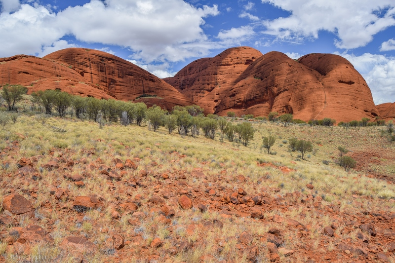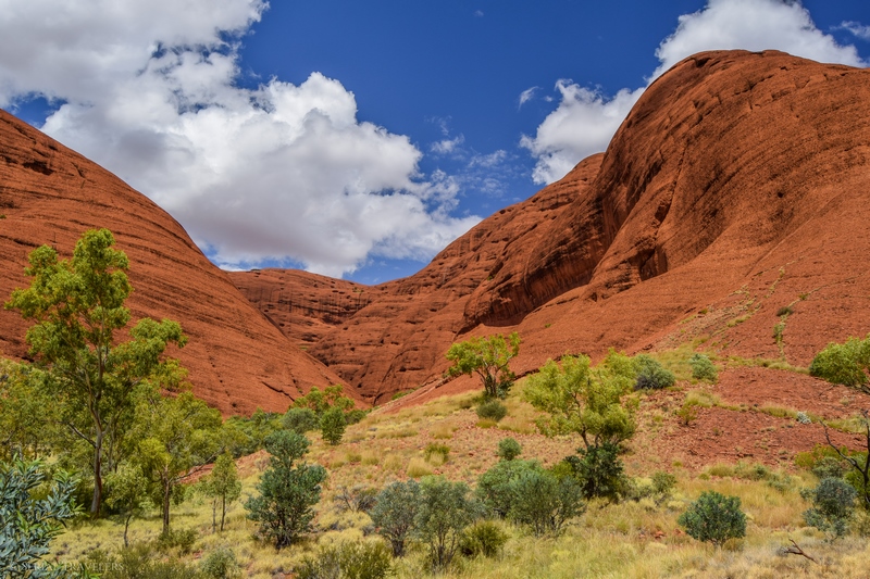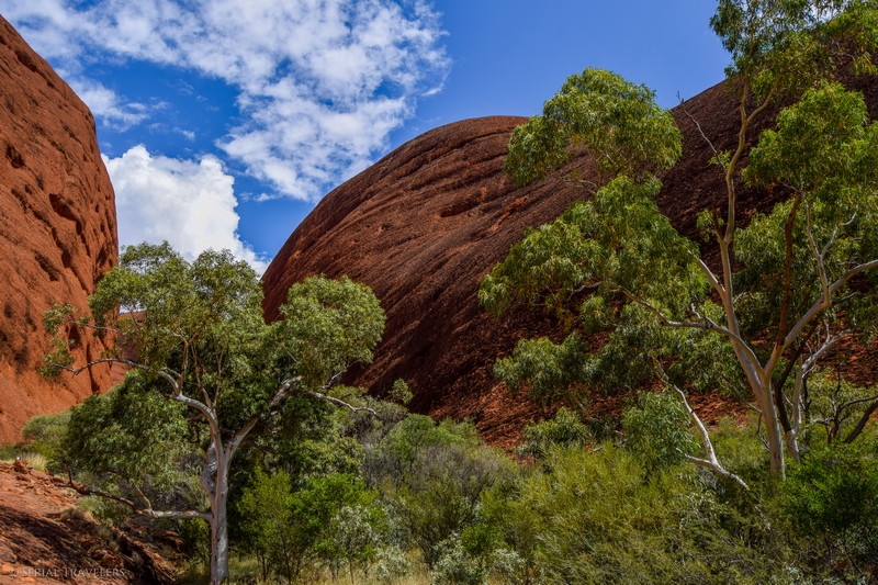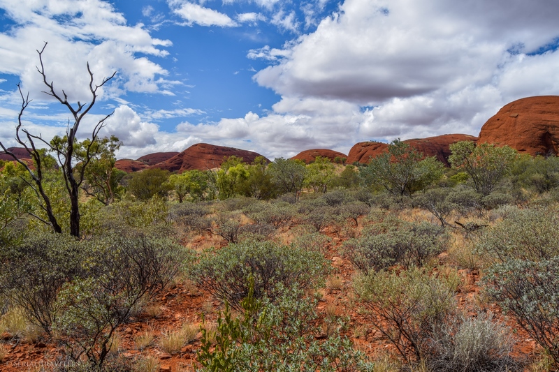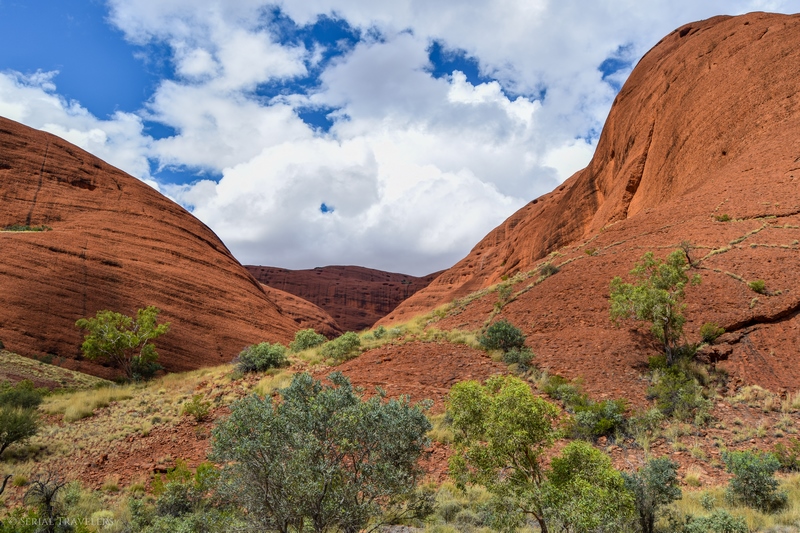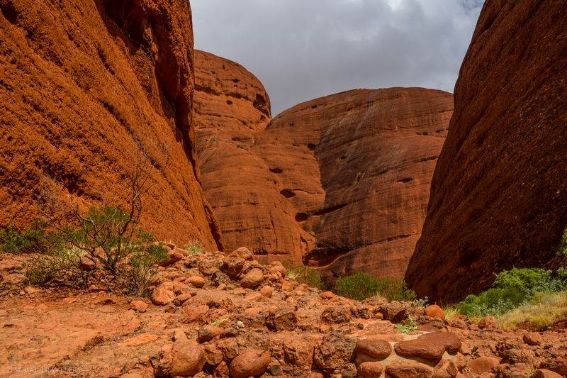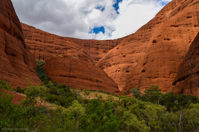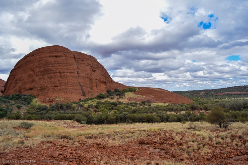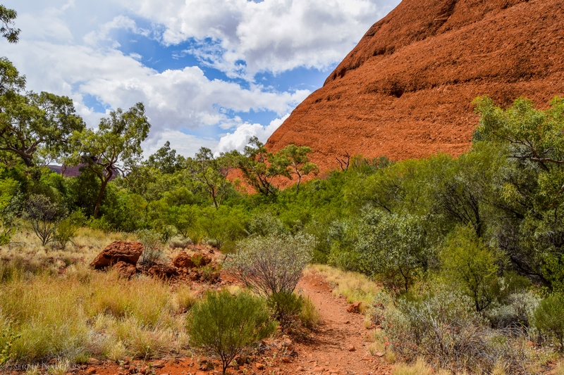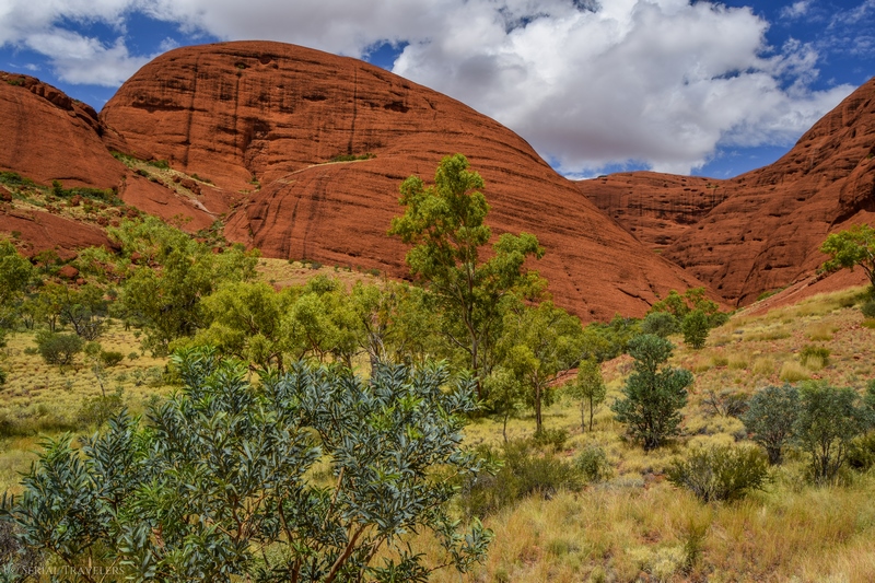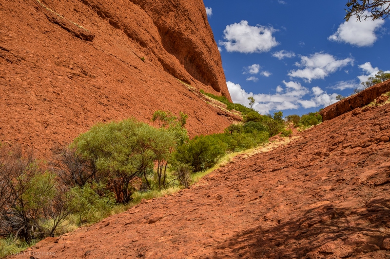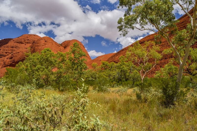 Suite au point de vue de Karingana Lookout, il faut de nouveau descendre une portion de sentier très raide, terminant au milieu d’herbes hautes et d’une végétation tellement dense qu’il ne sera pas facile d’avancer entre les buissons ! Puis, devant nous, s’étendent enfin à perte de vue les dômes ceinturant la plaine centrale de Kata Tjuta. Pour nous, il s’agit de la portion la plus belle du sentier, là où se mélangent le plus harmonieusement le rouge de la roche et le vert de la végétation !