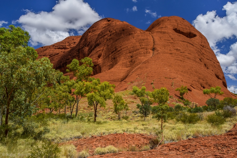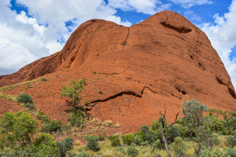 Kata Tjuta (à prononcer “Kata Tchouta”) signifie littéralement « plusieurs têtes » en Pitjantjatjara, l’un des principaux peuples Aborigènes de la région, faisant partie de la famille des Anangu, propriétaires ancestraux du lieu et d’Uluru. Ce site, considéré comme sacré par les Anangu, est composé de 36 dômes constitués de granit et de basalt, incorporés dans une matrice de grès, leur conférant leur couleur rouge. Parmi ces 36 monolithes, qu’on appelle aussi inselbergs, le Mont Olga culmine à 546 m au-dessus de la plaine environnante, soit presque 200 mètres de plus qu’Uluru !