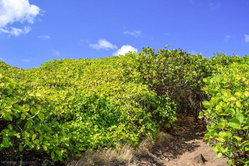 Nous nous éloignerons de la plage en revenant vers l’intérieur des terres, en longeant la mince frontière entre la forêt littorale d’arrière-plage et la forêt de raisiniers grande feuilles, que l’on appelle écotone (frontière entre deux milieux naturels). D’ailleurs, la forêt littorale de l’arrière-plage est peuplée par un arbre très dangereux et toxique : le mancenillier, dont la sève et les fruits peuvent causer de graves brûlures en cas de contact avec la peau !
