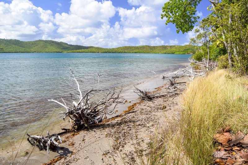 Après avoir passé l’Anse de la Table du Diable, le sentier remonte et s’enfonce définitivement dans les terres. C’est donc la partie, qui nous a semblé la moins intéressante, car le tracé se situe dans la forêt, sans pouvoir observer les alentours. Fatigués et à cours d’eau, nous renoncerons également à l’un des plus beaux points de vue de la randonnée : la table d’observation du phare de la Caravelle. En effet, ce magnifique point de vue nécessitait encore 30 minutes de marche avec un dénivelé de près de 160 mètres ! Nous nous contenterons donc d’un dernier point de vue sur la baie du Trésor, visible par moments à quelques endroits sur le sentier du retour.