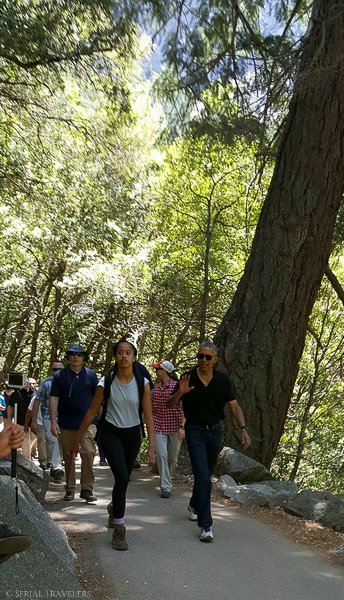 Etant donnée l’heure déjà bien avancée de la journée, nous décidons de ne faire que la première partie du Mist Trail, menant à la première cascade Vernal Fall (5 km A/R, réalisables en 1H30). Le sentier du Mist Trail grimpe franchement (à peu près comme Angel’s Landing à Zion mais sur une distance plus courte) et il va falloir une très bonne condition physique ! Nous démarrons le sentier et quelques minutes plus tard, deux jeunes Françaises venant à contre-sens accourent vers nous pour nous prévenir : elles viennent de voir Barack Obama, sur un pont situé à quelques minutes d’ici. L’excitation monte !
