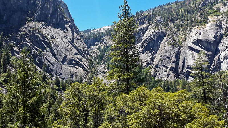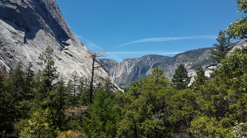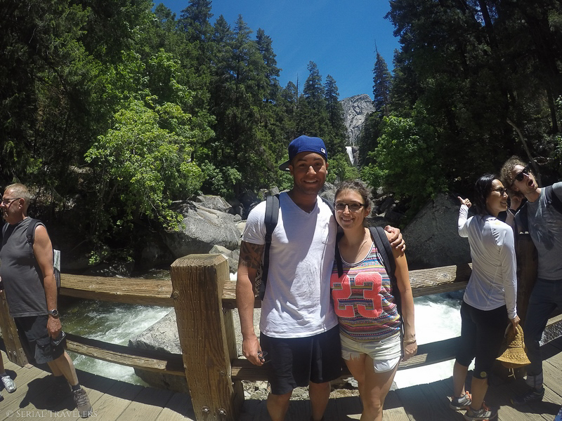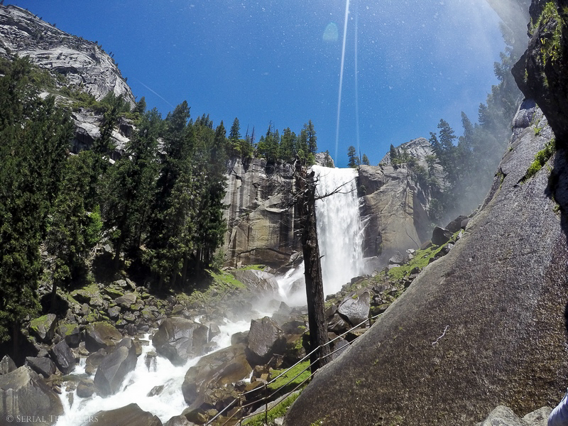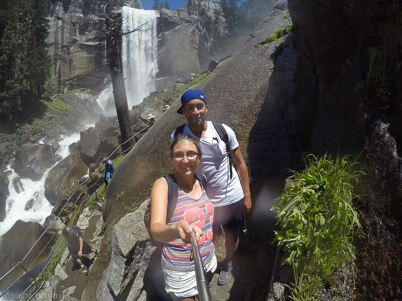 Nous arriverons à hauteur de la cascade de Vernal Fall vers 13H, et il faut dire que cette chute d’eau est TRÈS impressionnante ! Le débit d’eau est tellement important qu’on se retrouve vite trempés, malgré notre éloignement d’une vingtaine de mètres de la chute d’eau ! Arrivés au point de vue, il y a la possibilité d’accéder à un point de vue à mi-hauteur de la chute et un deuxième au sommet, via des escaliers de pierre, très glissants ! Tenez bien la rampe ! Nous nous contenterons du point de vue intermédiaire, qui offre déjà un très beau point de vue. Serial astuce : préférez prendre une GoPro plutôt qu’un appareil photo ou un portable, si vuos ne voulez pas les voir noyés sous des litres d’eau !