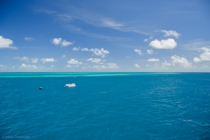 Une fois sorti du port d’Airlie Beach, le catamaran fonce à l’Est à travers l’archipel des Whitsunday Islands en direction d’Hardy Reef, l’un des milliers de petits récifs coralliens composant la Grande Barrière de Corail. Pourquoi ce récif en particulier ? Et bien, c’est sur ce récif qu’a été installé le « Heart Pontoon », un ponton flottant ancré en permanence sur le plancher océanique face au récif, à 39 nautiques des côtes (~70 km) !