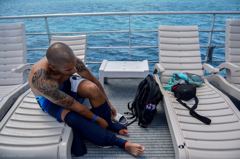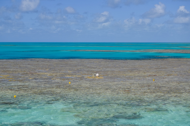 Une fois les combinaisons enfilées, nous fonçons dans l’eau pour partir à l’exploration des coraux. Mais attention, pas n’importe où ! En effet, un énorme filet a été déployé tout autour d’un côté du ponton et un membre de l’équipage du bateau patrouille autour de la zone en permanence pour empêcher les nombreux touristes inconscients de s’aventurer plus loin, ou de piétiner les coraux ! Et croyez-nous, malgré leur vigilance, on a vu de nombreux touristes le faire ! Au final, seule une petite portion du récif est accessible aux touristes, et ce n’est pas plus mal !