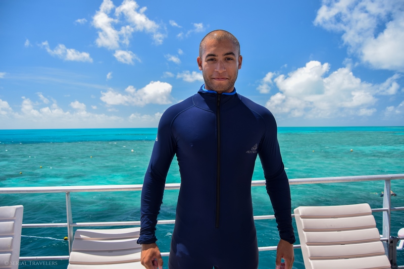 Comme indiqué plus haut, l’exploration de la GBC ne se fait pas directement depuis le bateau mais depuis un ponton (Heart Pontoon), ancré sur le plancher océanique, où le bateau vient accoster. Sitôt arrivés sur le ponton, nous avons le droit à une combinaison de protection chacun. Pourquoi ? Et bien, malgré le caractère calme et idyllique du lieu, la GBC abrite des box-jellyfish, l’un des animaux les plus dangereux des eaux australiennes ! Il s’agit de méduses de petite taille (40 cm), en forme de boite, possédant 60 tentacules avec le potentiel d’infliger plusieurs piqûres mortelles pour l’Homme. On les retrouve dans les eaux tropicales du Queensland entre les mois de novembre et mai. D’autre part, ces protections protègent également des coups de soleil, très méchants sous les latitudes !