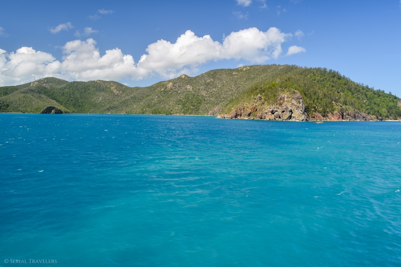 Vers 8H nous nous engouffrons tous dans l’immense baleine, disposant de 3 ponts et nous installons sur le pont supérieur, en terrasse ! L’immense catamaran sort du port d’Airlie Beach et entame le voyage par un premier stop, après environ 45 min en mer, sur Hamilton Island où nous ferons descendre et monter plusieurs passagers pour la suite du périple. Ensuite, l’excursion continue avec une navigation tranquille entre les îles paradisiaques de l’archipel des Whitsundays, baignées par les eaux bleues turquoises de la Mer de Corail !