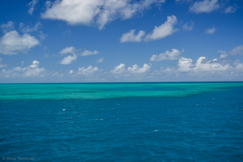 Vers 11H du matin, c’est-à-à-dire 3 heures après avoir navigué vers l’Est au départ d’Airlie Beach, se dresse enfin devant nous la Grande Barrière de Corail tant attendue ! Sur place, en plein océan, se dresse de larges bandes d’eau bleue turquoise, tranchant franchement avec le bleu profond de la Mer de Corail (en réalité l’océan Pacifique).