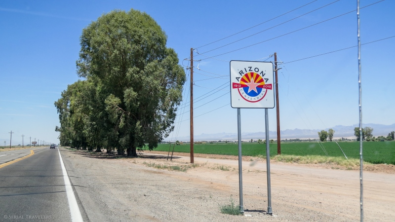Quant à Needles, il s’agit de la ville située le plus à l’Est du comté de San Bernardino, et donc la plus à l’Est de la Californie ! La ville est bordée par le fleuve Colorado, qui sert de frontière naturelle entre la Californie et l’Arizona ! Cependant, Needles ne présente pas beaucoup d’intérêt, sauf pour faire le plein d’essence. En sortant de la voiture dans la station-service du coin, nous sommes écrasés sous une chaleur étouffante : la climatisation nous l’avait presque fait oublier, mais le mercure affiche plus de 35°C à l’ombre au mois de juin en Arizona !