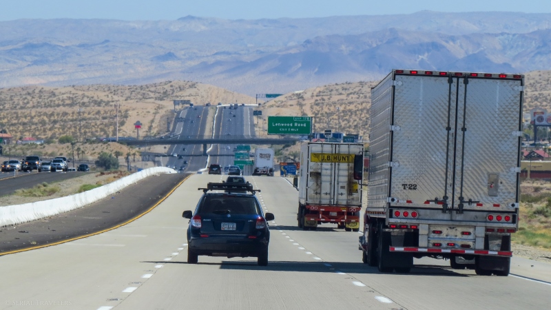 Dimanche 5 juin 2016, réveil matinal pour prendre notre petit-déjeuner et quitter notre motel d’Hollywood vers 7H30, pour avaler les 8 heures de route qui nous séparent de Grand Canyon. Après contrôle de la pression des pneus et un plein d’essence, nous fonçons en direction de l’intersate I-15N. En ce dimanche, nous sommes plutôt chanceux, car il y a très peu de trafic et nous pouvons sortir assez facilement de Los Angeles.