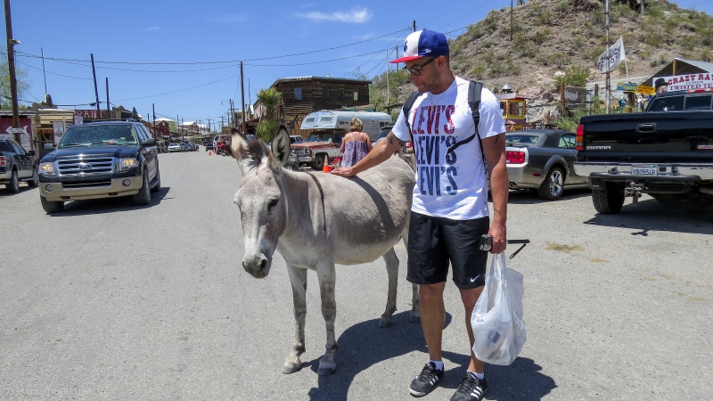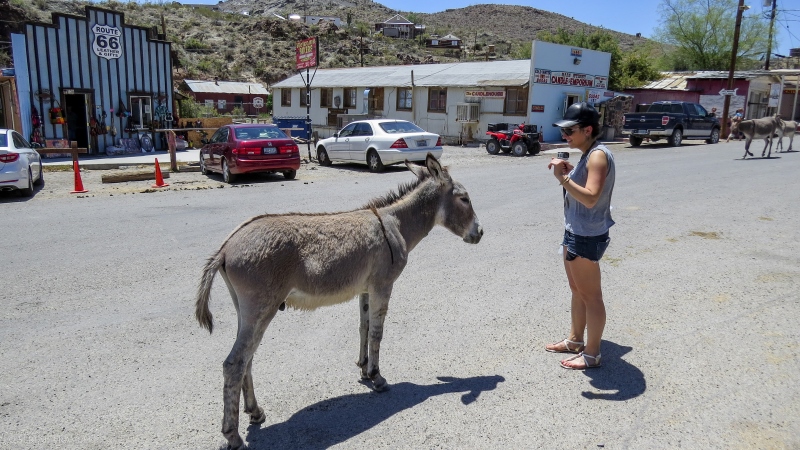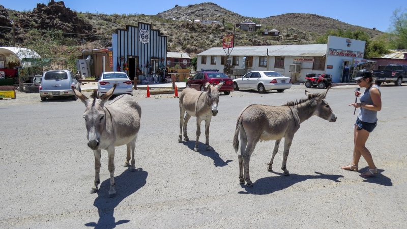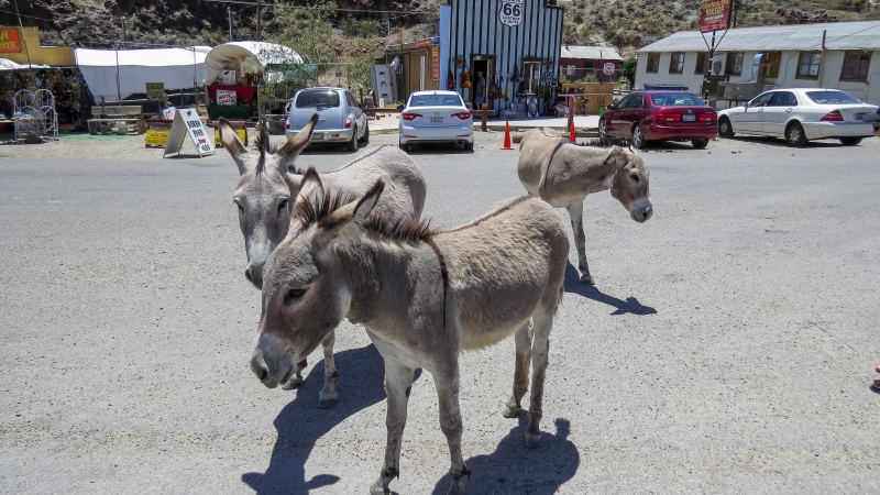 Nous traversons Needles avant de bifurquer vers l’Est en empruntant de nouveau la route 66, en direction d’Oatman. Cette charmante petite bourgade est perdue au milieu des Black Mountains du comté de Mohave en Arizona, à 40 km au Sud-Ouest de Kingman. La ville fut nommée en l’honneur d’Olive Oatman, une fillette de l’Illinois, qui fut capturée par des Amérindiens, lors du voyage de sa famille de pionniers vers l’Ouest, en 1851. Olive fut ensuite échangée avec les Mojaves, qui l’adoptèrent en lui tatouant le visage, selon leur coutume…