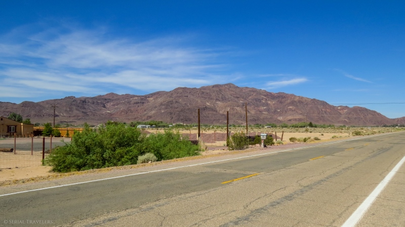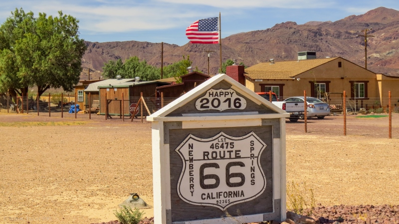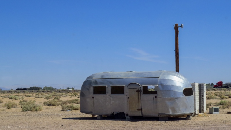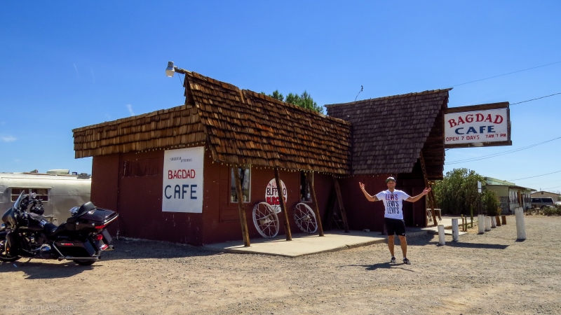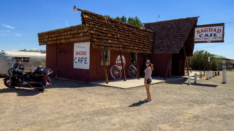 Après avoir roulé pendant 2H30 depuis L.A., nous arrivons dans la localité de Newberry Springs en rejoignant la route 66, qui longe l’interstate. En effet, contrairement à ce que son nom indique, le Bagdad Café ne se situe pas à Bagdad, mais à Newberry Springs, à 37 km à l’Est de Barstow et à 80 km à l’Ouest de Bagdad. Aujourd’hui, Bagdad n’est plus qu’un village fantôme, planté dans le comté de San Bernardino, en Californie. La fondation de Bagdad remonte à 1883 lorsqu’une ligne de chemin de fer fut créée pour relier Needles (Arizona) à Barstow (Californie).