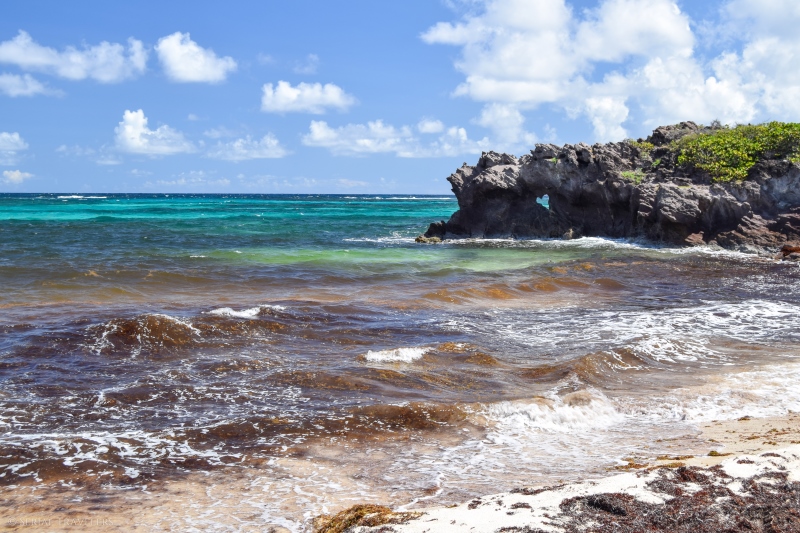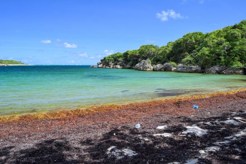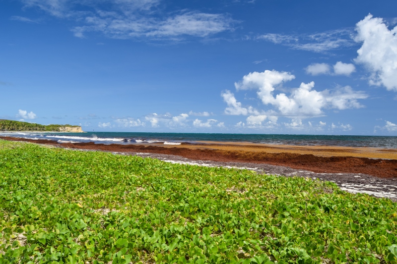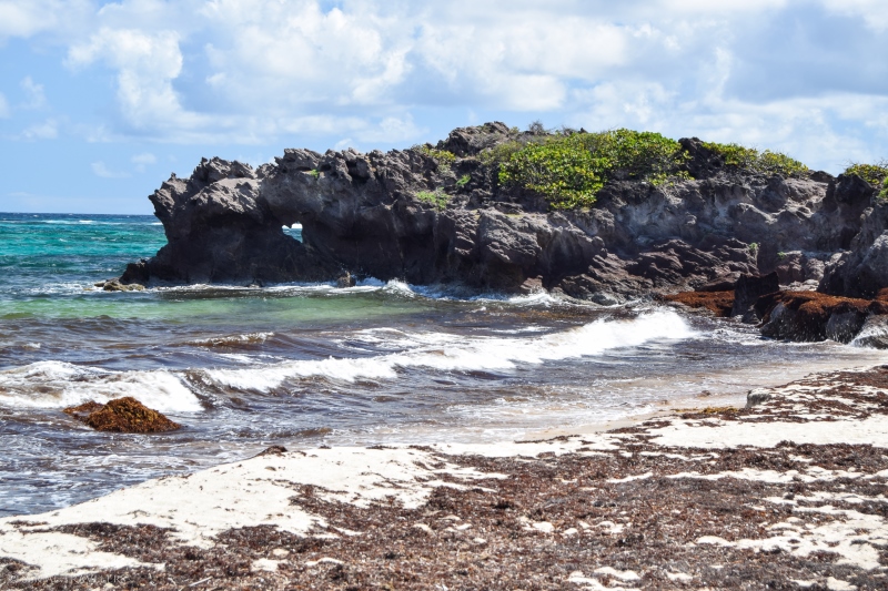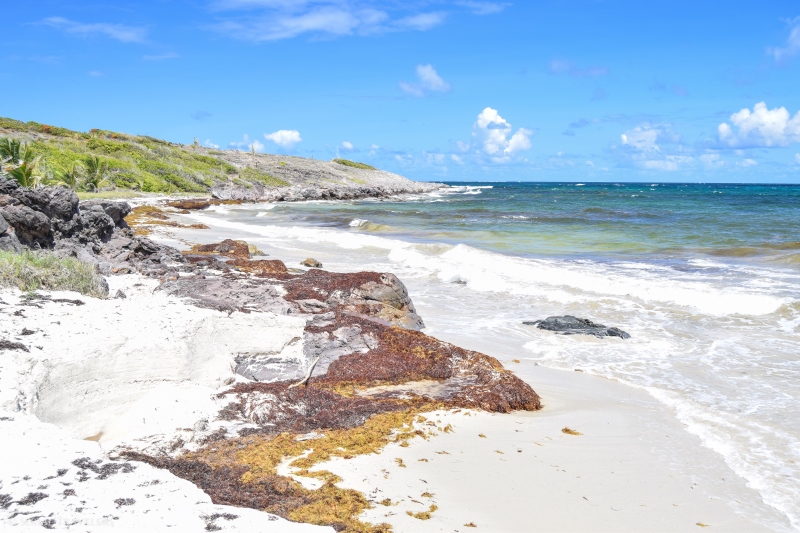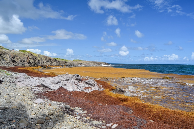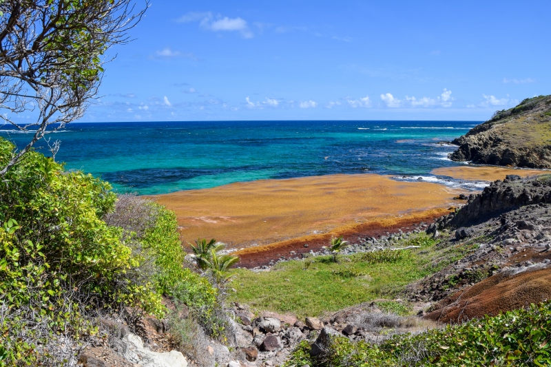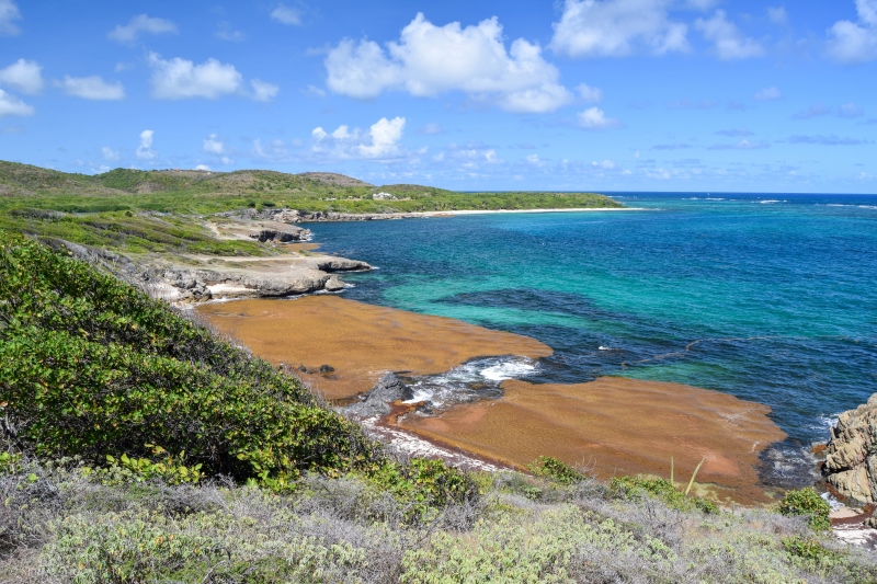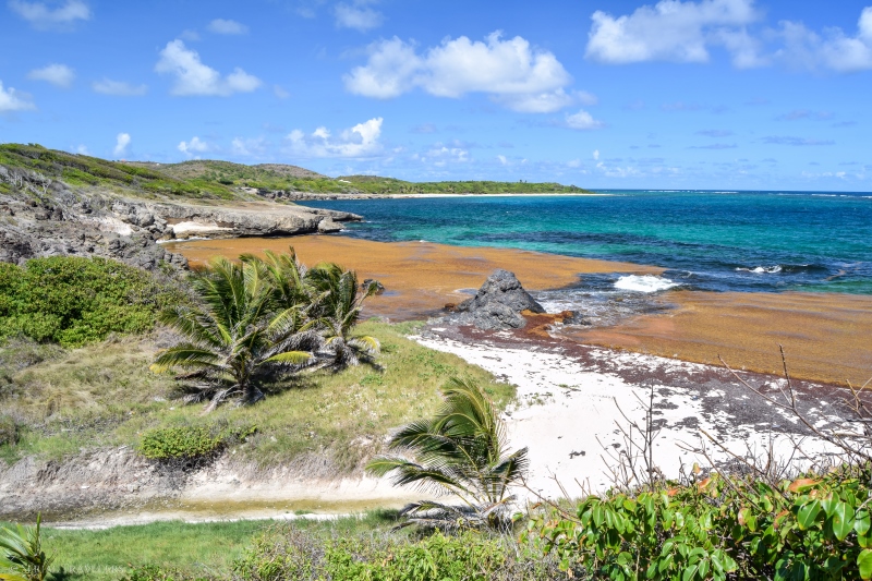 Malheureusement pour nous, nous avons trouvé le cul de sac-de-sac totalement à sec, avec des centaines d’algues sargasses échouées en masse, dégageant ici une odeur pestilentielle… Heureusement, le contournement du cul-de-sac ne prend qu’une dizaine de minutes et récompense les marcheurs par une superbe vue sur la pointe de l’anse baleine.