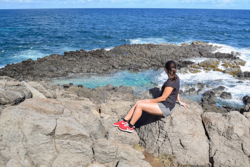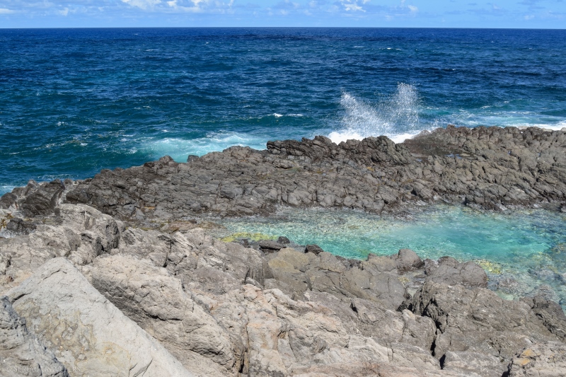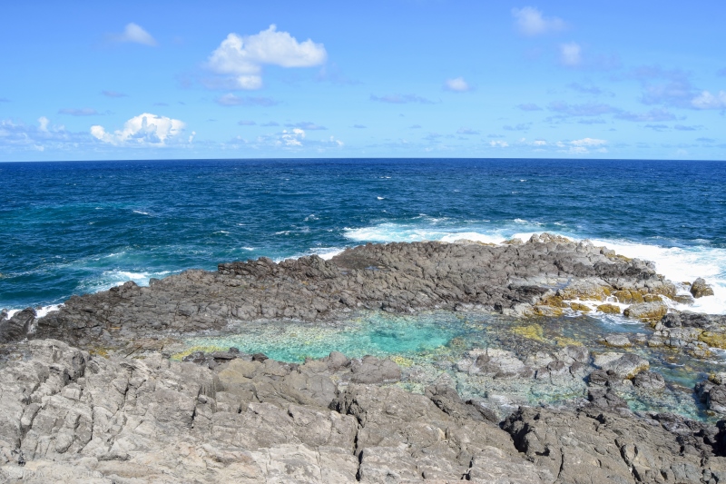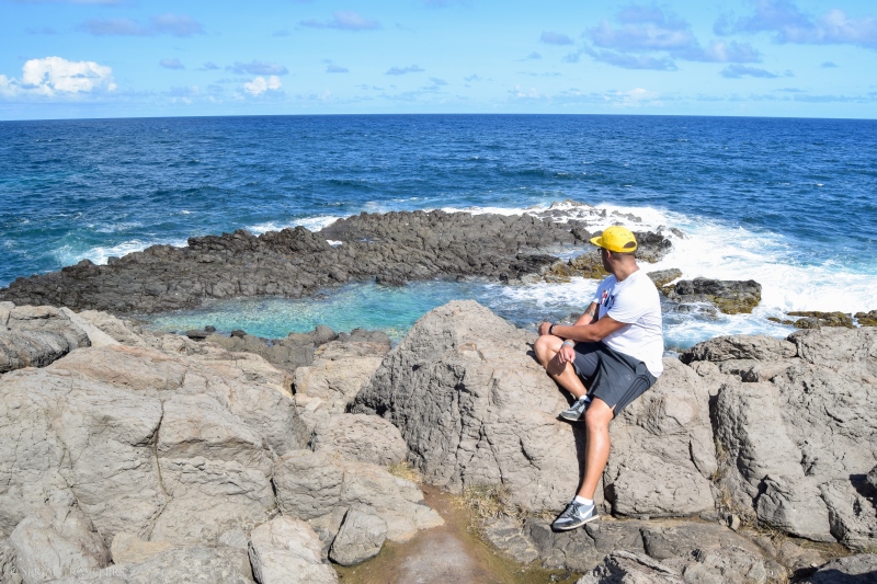 Tout au bout de cette langue de terre se trouve l’œil Bleu, un bassin d’eau de mer formé dans la roche basaltique qui compose la presqu’île. Au prix d’une petite ascension et d’une descente entre les gravas de pierre volcanique, on accède à la piscine naturelle de l’œil Bleu, qui offre un paysage saisissant et une eau cristalline dans un cadre idyllique ! Nous resterons quelques minutes en admiration devant ce merveilleux bassin, sans y faire trempette 🙂