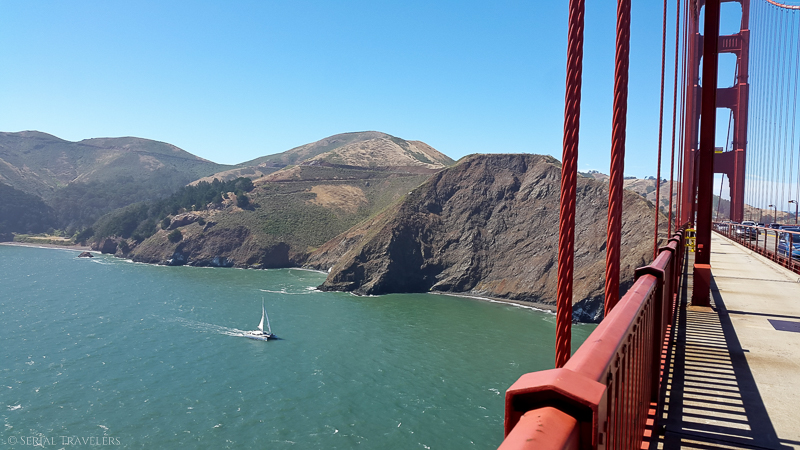 Vers 16H, nous arrivons enfin au bout (cela dit, ça n’a rien de difficile, mis à part le vent) et bifurquons sur une route en lacet située sur la gauche, tout de suite après la fin du pont. Cette route qui descend en lacet, permet de passer sous le tablier du pont au niveau de la première pile (dans le sens Sausalito > San Francisco) et offre une vue imprenable, à la fois sur la baie et sur le Golden Gate Bridge depuis Vista Point.