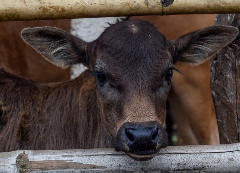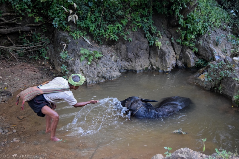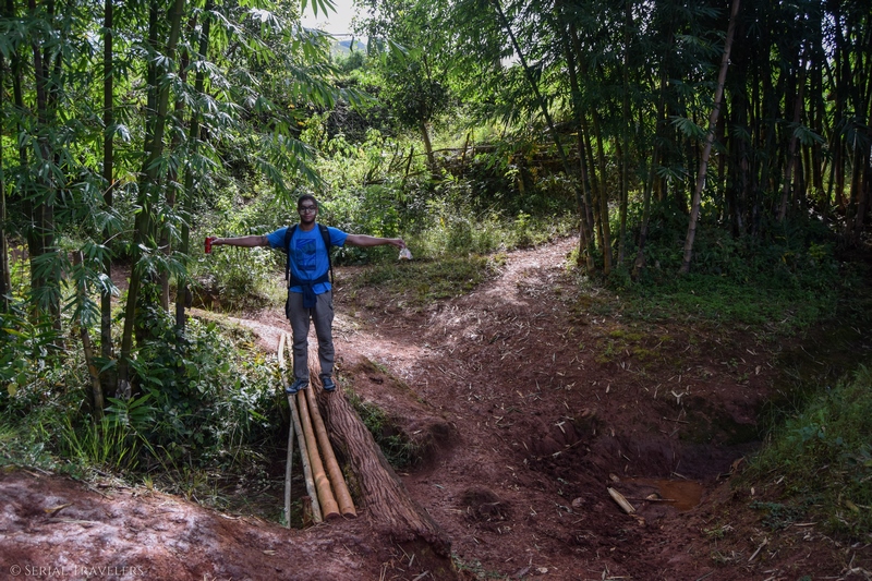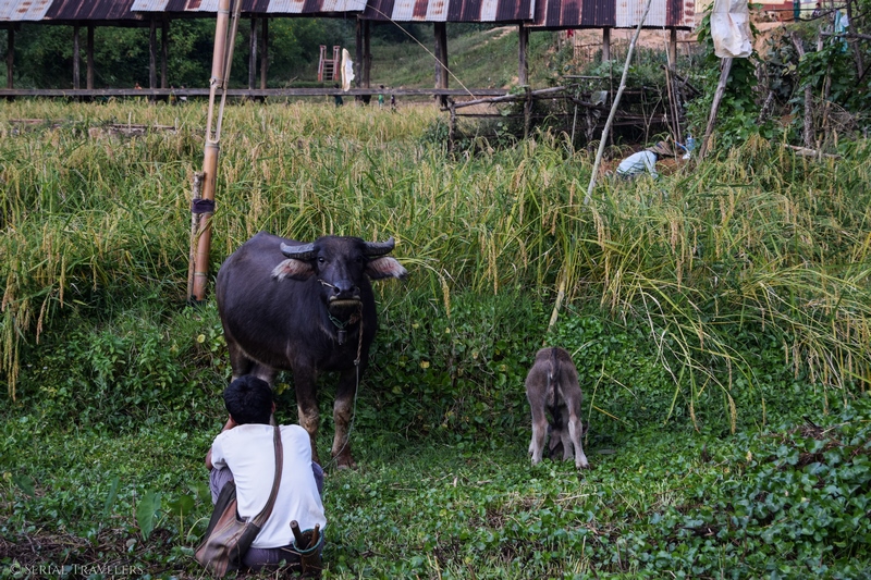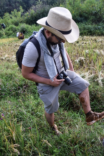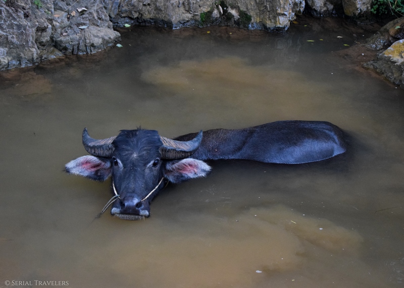 Regardez où vous marcher, les sentiers ne sont pas stables ! Ça vous évitera peut être de mettre les deux pieds dans un ruisseau comme Joao 🙂 . Faites attention aux buffles également surtout quand il y a des bébés, celui sur la photo ci-dessous a voulu nous charger juste après la photo !