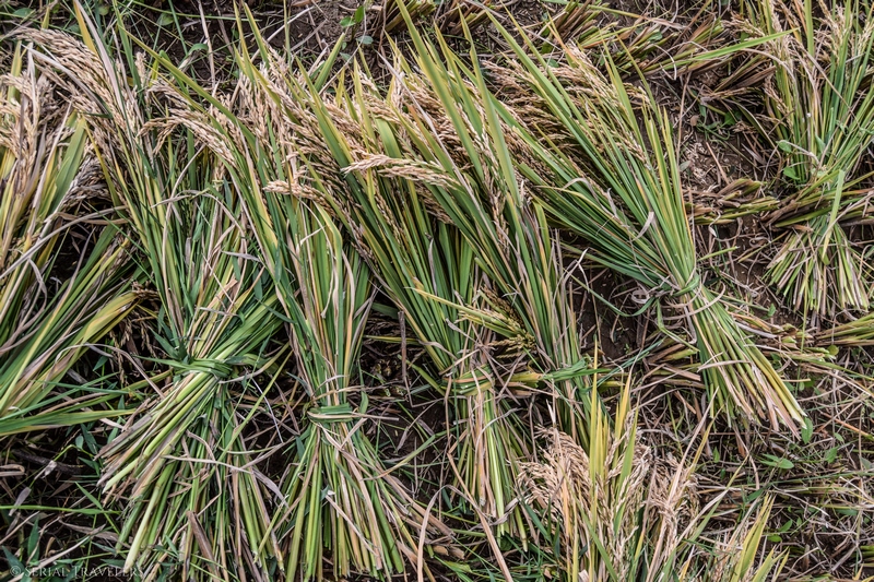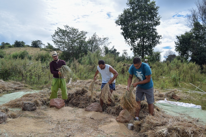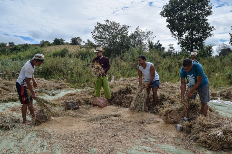 Nous croisons des travailleurs qui battent les tiges de riz pour en extraire les grains. Du coup, Thomas, Joao et Ricardo ont testé aussi !