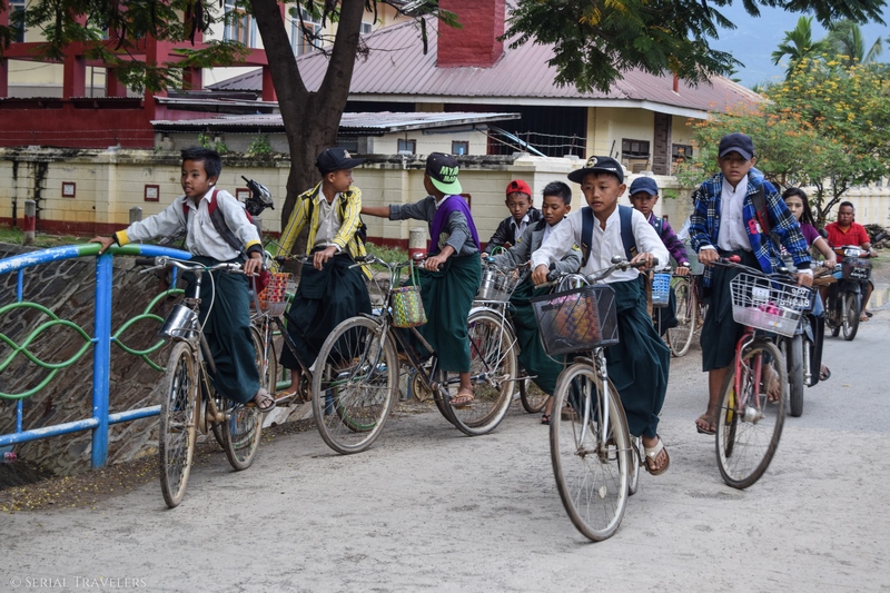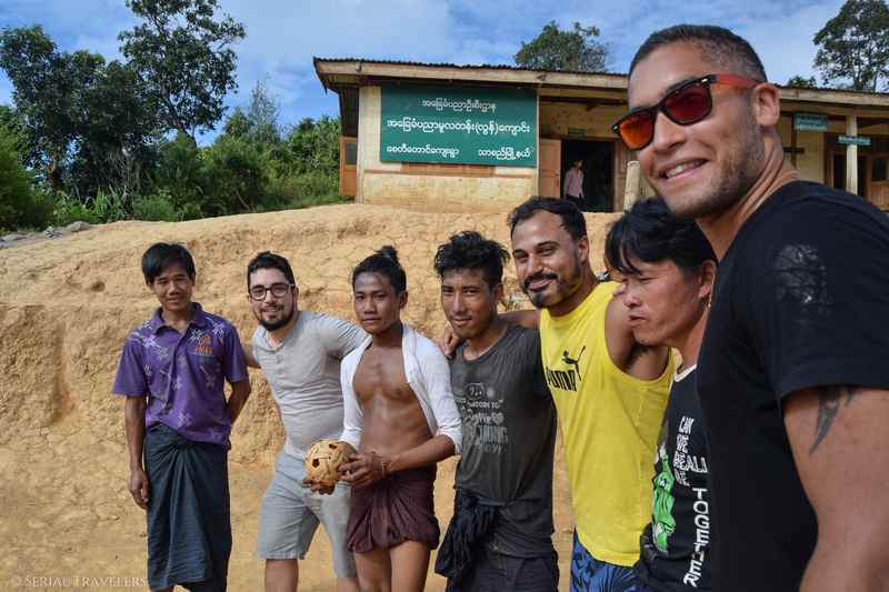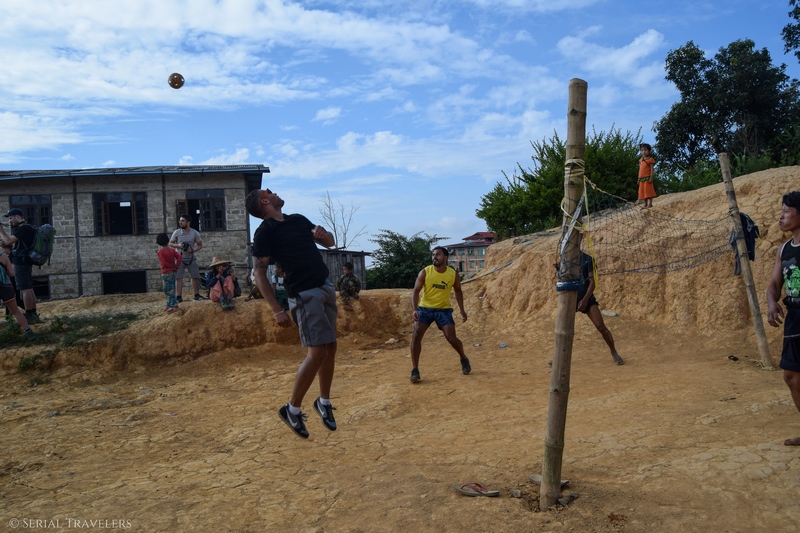 On fait une pause à Myindaik, un village reculé où des jeunes jouent au chilon. Ce jeu traditionnel birman fait penser au volley avec son filet au milieu, mais la balle est en rotin tressé. Autour, des écoliers viennent nous saluer et sont heureux de poser alors on s’en donne à cœur joie !