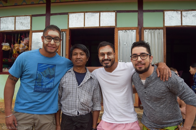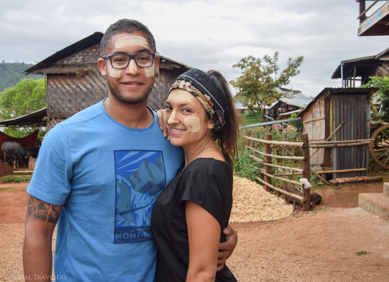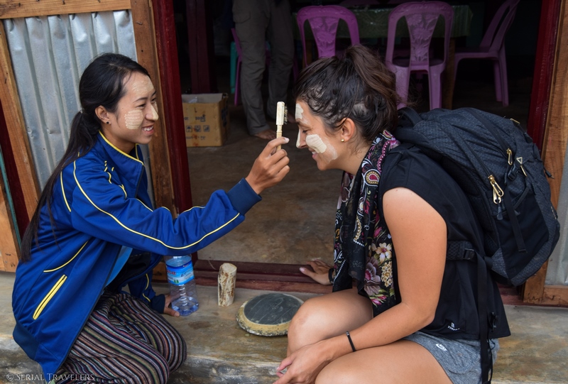 Le lendemain, jeudi 9 novembre 2017, nous mettons deux heures à nous préparer entre super petit déjeuner, photos avec la famille et thanaka pour tout le monde ! Cette préparation cosmétique blanc-jaune que l’on voit sur les visages des Birmans est végétale.