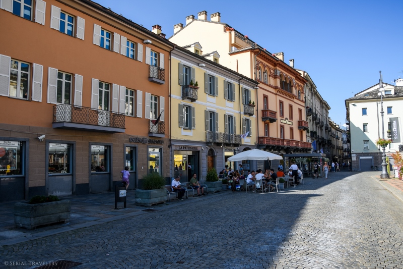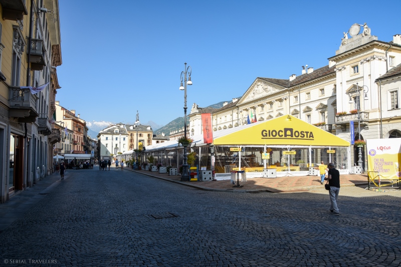 Nous démarrons la visite d’Aoste en commençant par le centre-ville contemporain (post époque romaine), où l’on trouve le Comune di Aosta (l’hôtel de ville) et de très jolis bâtiments bigarrés. D’ailleurs, en ce 15 août, nous tomberons sur le festival Gioc Aosta, une manifestation culturelle où près de 300 bénévoles initient habitants et touristes de passage à des jeux de société en tout genre sur la place Channoux !