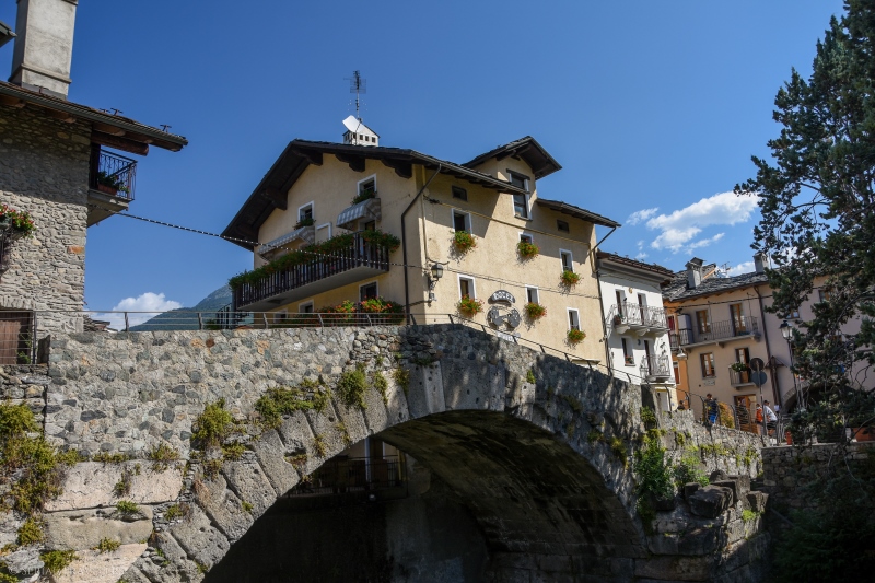 On poussera un peu plus vers l’Est pour apercevoir le pont romain qui enjambait l’ancien lit du torrent Buthier. Depuis le Moyen-Âge, ce pont n’enjambe plus qu’un lit de cailloux, le cours naturel du Buthier s’étant décalé d’une centaine de mètres à l’Ouest. Ce pont de pierres de 17 m d’ouverture est remarquablement bien conservé. Il n’y a pas de quoi casser 3 pattes à un canard, mais le monument nous aura permis de faire une pause fraîcheur autour d’un ancien lavoir situé à proximité du pont.