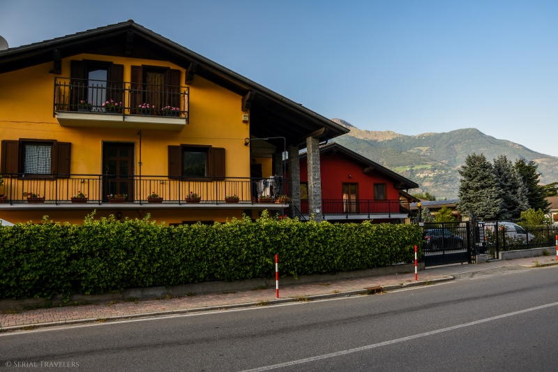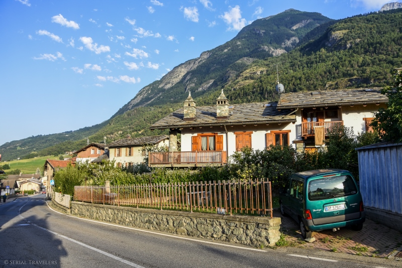 Ayant profité de l’après-midi pour nous reposer (sieste, puis sortie au parc pour Noah), nous ressortirons à pied dans Pollein vers 19H, pour apercevoir les chalets à l’architecture si particulière de ce petit coin d’Italie. Les toits en ardoise peu pentus tranchent radicalement avec les maisons que nous connaissons dans la moitié Nord de la France ! Cette petite sortie nous aura également permis de nous rendre compte de l’abondance potagère dans les jardins de Pollein : on y trouve des fruits et légumes à foison (courgettes, tomates, courges, pommes mais aussi du maïs) !