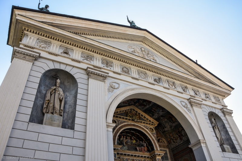 Nous passons rapidement au niveau du Cryptoportique du forum romain, sans nous y arrêter, avant de nous attarder plus longuement devant la façade de la cathédrale Notre-Dame de l’Assomption. Cet édifice religieux est le principal lieu de culte d’Aoste et constitue également l’évêché du diocèse d’Aoste. Oy trouve d’ailleurs une très belle sculpture gothique datant du XVIème siècle au sein de l’atrium creusé dans la façade avant !