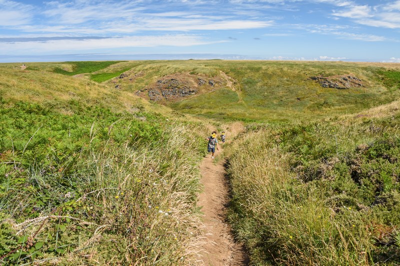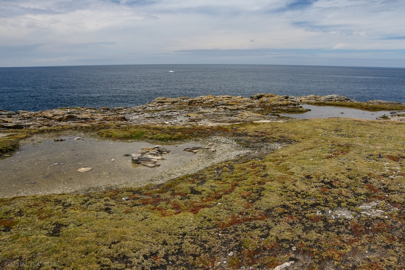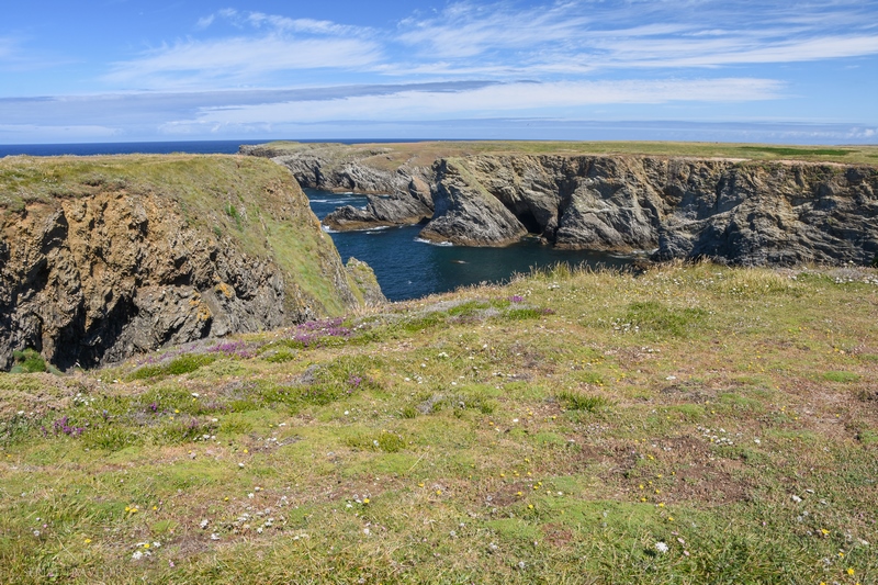 Après avoir mangé dans une sandwicherie à proximité du phare, nous reprenons la voiture en direction du Nord-Ouest de l’île, toujours sur la côte sauvage, mais à proximité de Sauzon. L’Apothicairerie correspond à un site naturel dont le nom est tiré de la grotte du même nom, aujourd’hui interdite au public en raison de nombreux accidents arrivés par le passé… Le site se présente sous forme d’une plaine tapissée d’une lande à bruyère vagabonde, un écosystème quasiment endémique – on ne trouve cette lande qu’à Belle-Île, Groix et sur l’île d’Yeu – composé de bruyères et d’ajoncs maritimes.