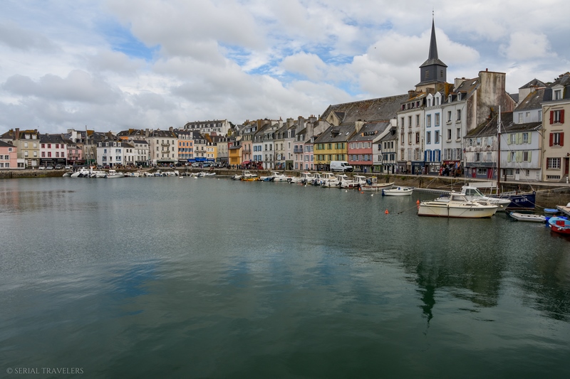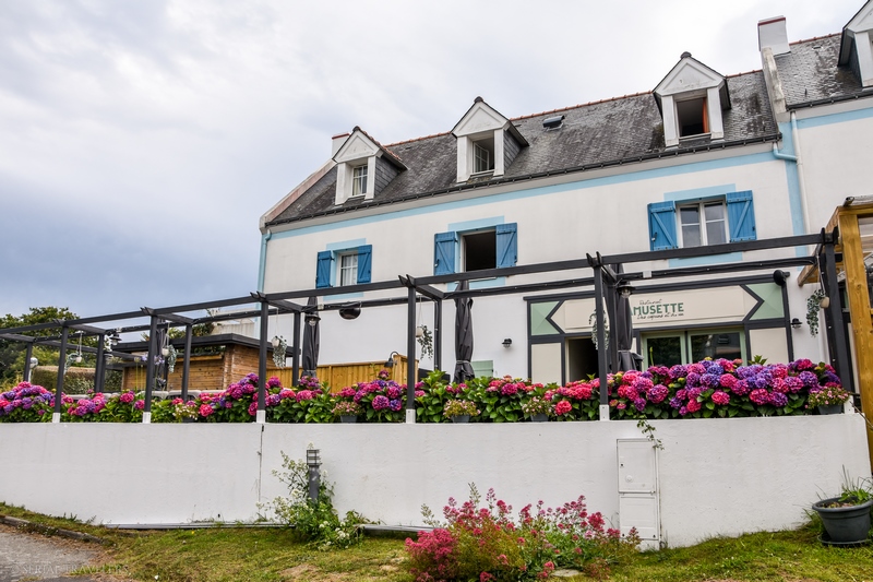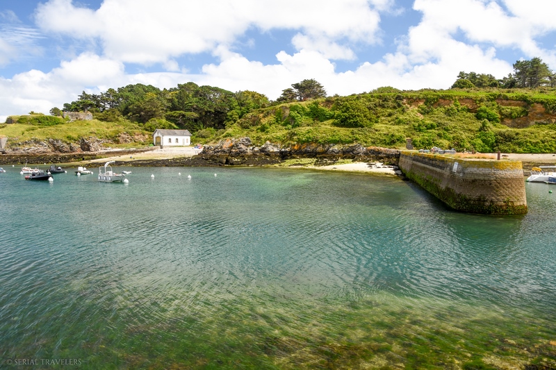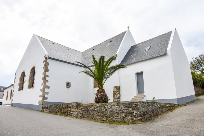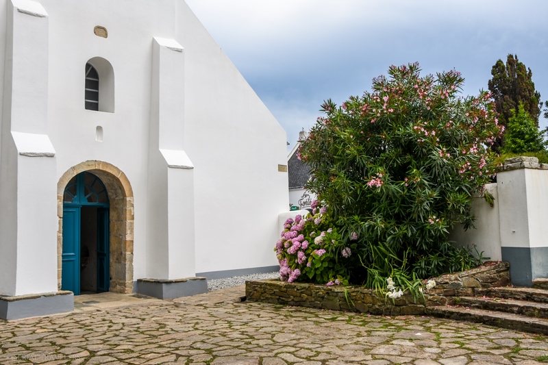 Peu avant 17H, nous débarquons à Locmaria, petit village situé à l’extrême pointe Sud-Est de l’île. Nous n’y restons que quelques minutes, le charme n’opérant pas du tout avec ce village de 900 âmes. Seule la petite église Notre-Dame-du-Bois-Tors, construite en 1070, nous aura marqué avec sa façade blanche immaculée et son imposant palmier phénix.