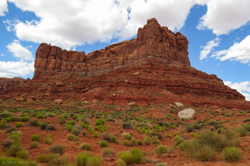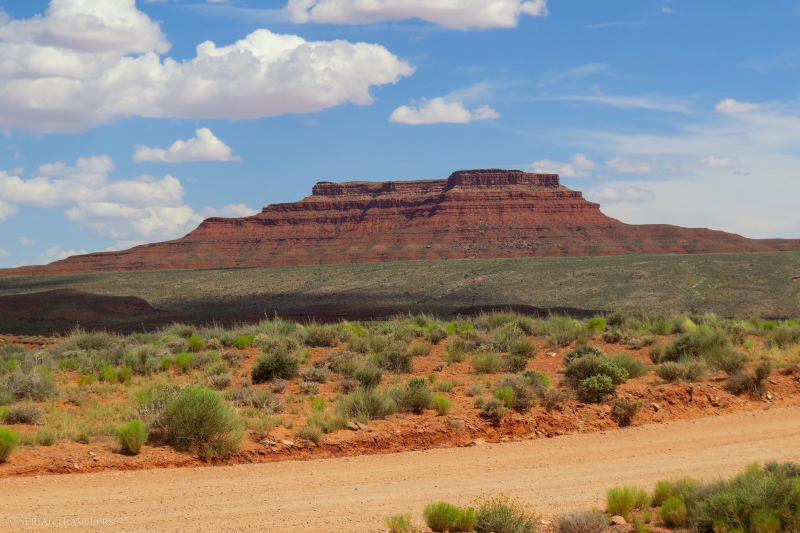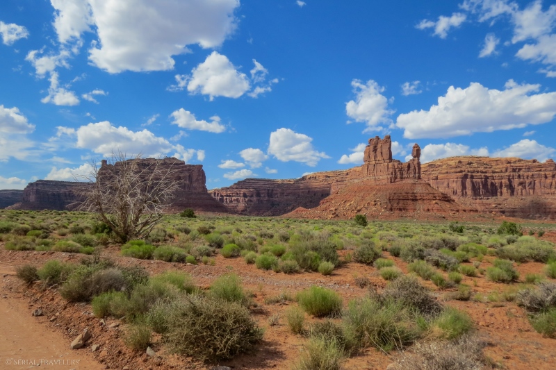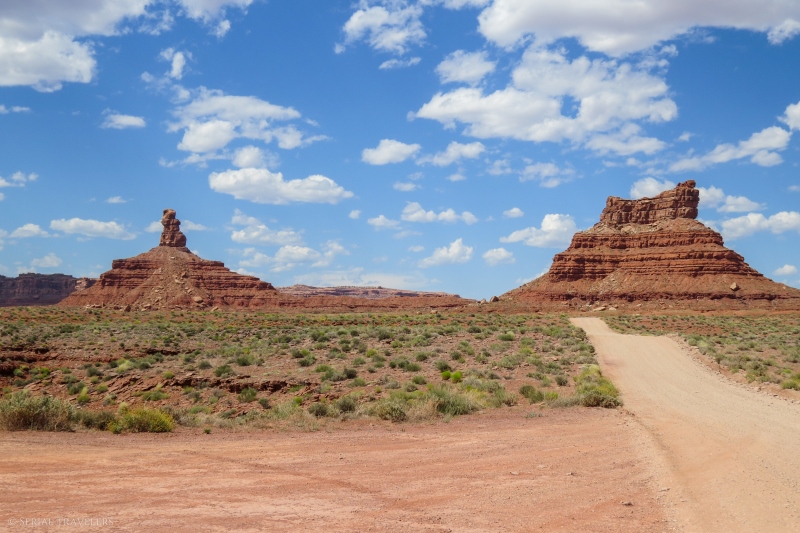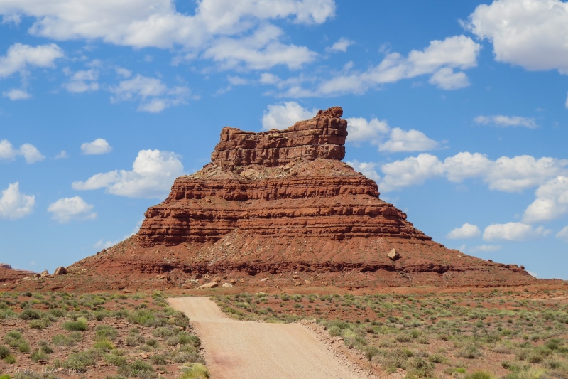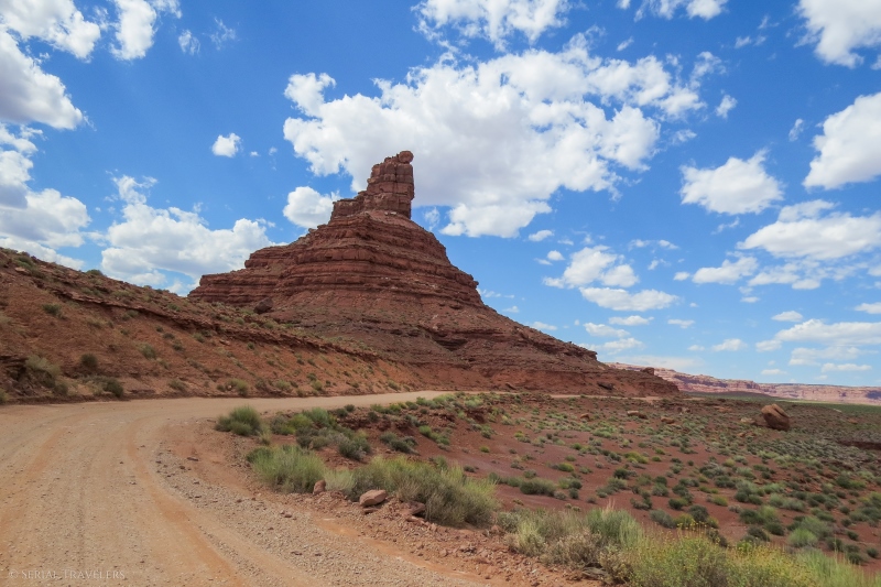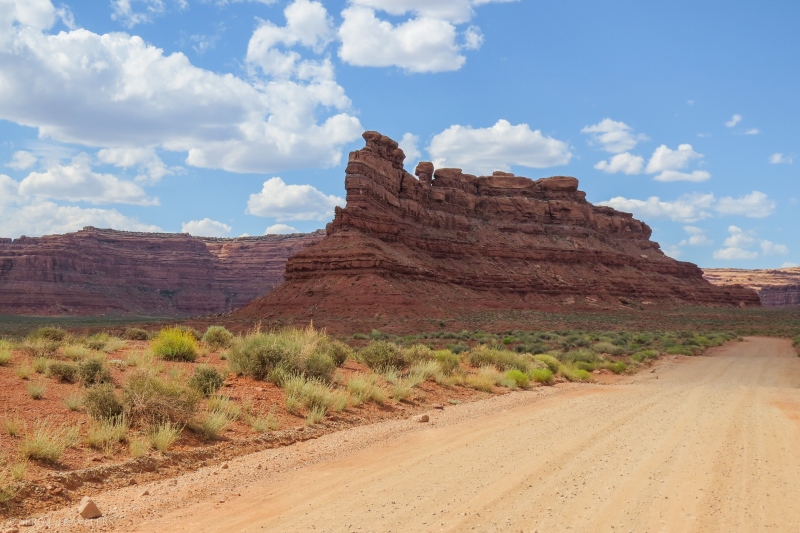 Vers 15H, nous atteignons tant bien que mal l’entrée Nord de Valley of The Gods, car il faut le dire, c’est assez mal indiqué ! Etant donné qu’il ne s’agit pas d’un parc à proprement parlé, l’entrée est complètement libre (sans barrière, ni point de passage) et la Valley of The Gods road est assez chaotique… La piste de terre est en effet défoncée avec la présence de pas mal de roches, mais avec une bonne garde au sol et en roulement doucement, ça passe sans problème 🙂