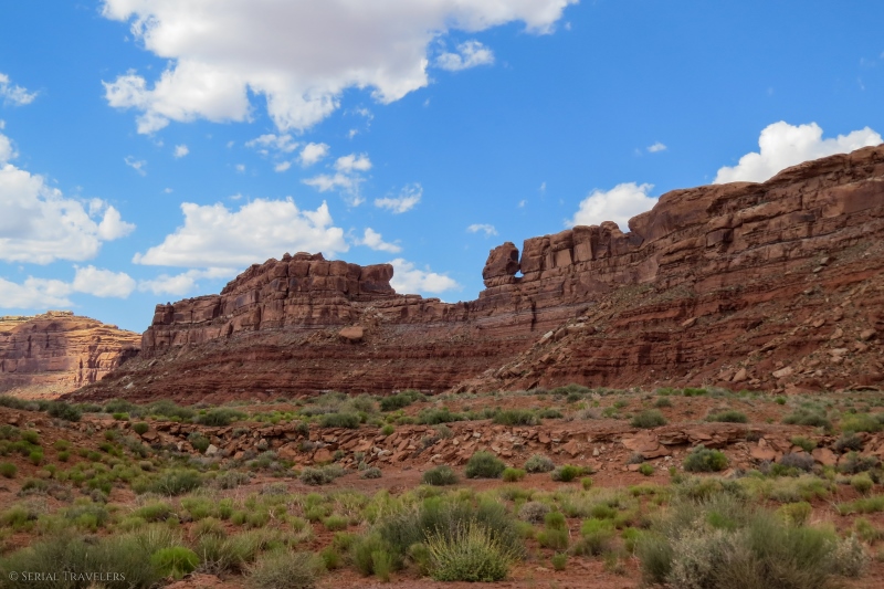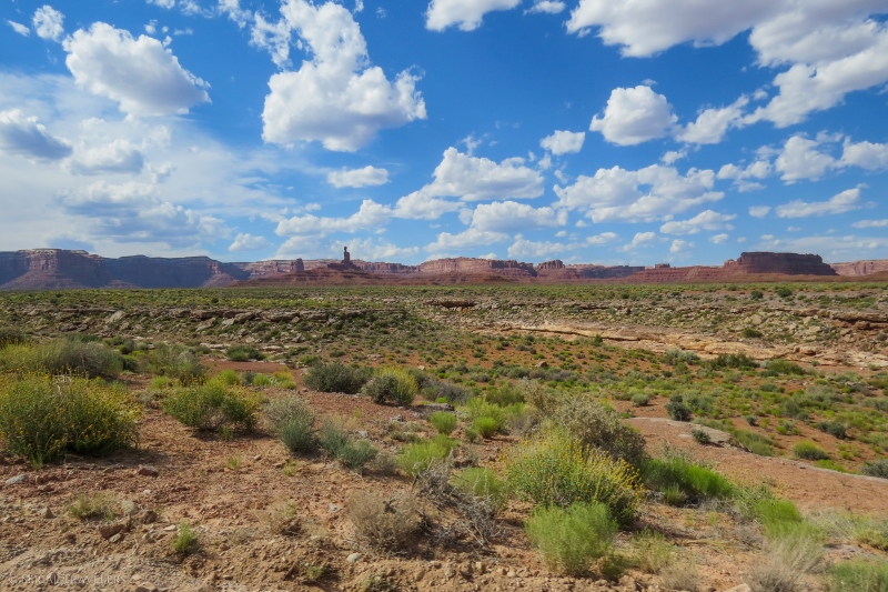 Mercredi 8 juin 2016, après avoir randonné à cheval et parcouru la Valley Drive dans le parc tribal de Monument Valley le matin, nous partons vers 14H en direction du Nord pour atteindre Valley of The Gods. La route US-163 offre de très beaux panoramas sur des paysages désertiques et sur des curiosités géologiques comme « Mexican Hat », un rocher en forme de sombrero situé à proximité du village du même nom.