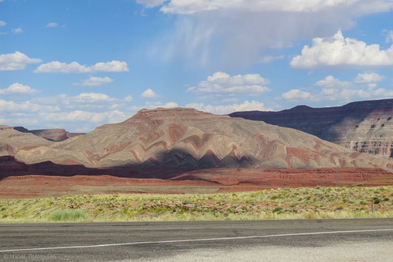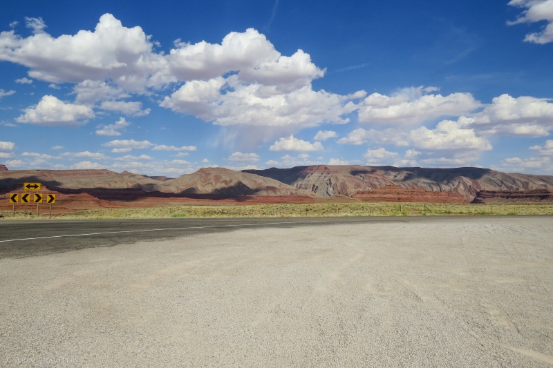 Rappelez-vous le célèbre film éponyme où Forrest Gump a entrepris de courir pendant des mois sans s’arrêter ! Et bien, à un moment donné, il décide de s’arrêter de courir, et il prend cette décision sur la route US-163, au Nord de Monument Valley. C’est le paysage qu’on aperçoit au loin avec les monuments de grès, à l’extrémité de la route ! Malheureusement pour nous, en revenant sur Monument Valley après Valley of The Gods, le temps s’est couvert et nous n’avons pas pu faire de belles photos…