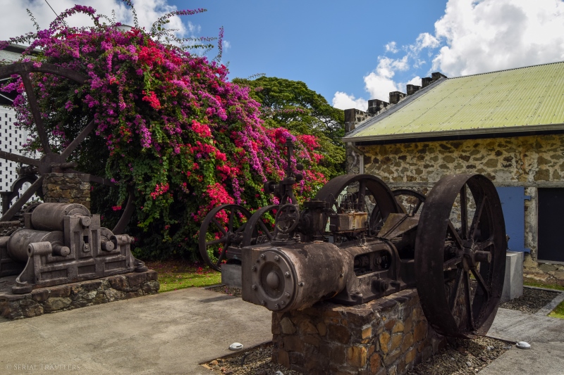 Après avoir passé 40 minutes à arpenter ce très beau jardin, nous nous dirigeons vers la chai Georges-Louis Clément, matérialisant l’entrée de l’ancienne distillerie. L’ancienne distillerie qui produisait autrefois le rhum Clément a désormais été reconvertie en musée consacré à la fabrication du rhum. Et oui, de nos jours, la canne à sucre récoltée sur le domaine de l’Acajou est maintenant traitée à la distillerie du Simon, au François.