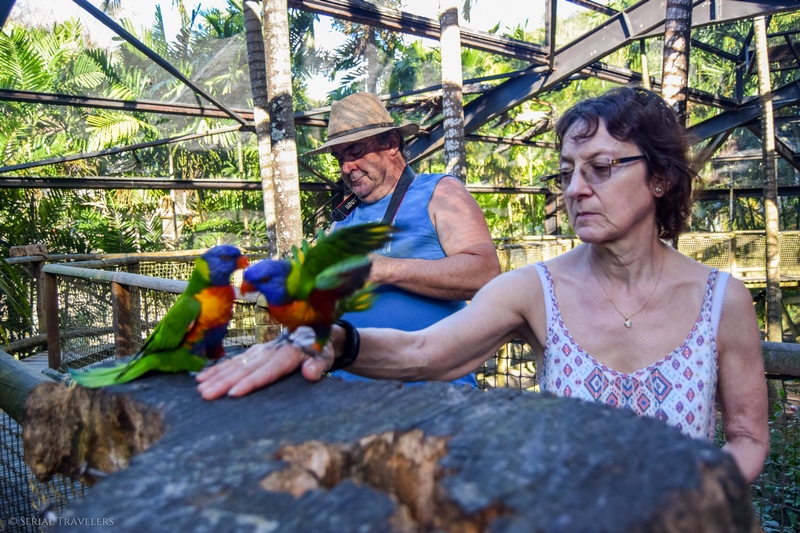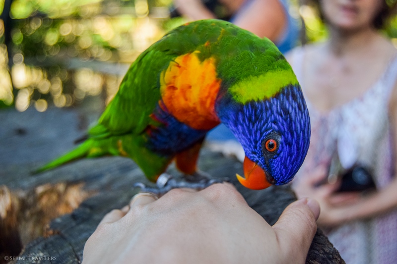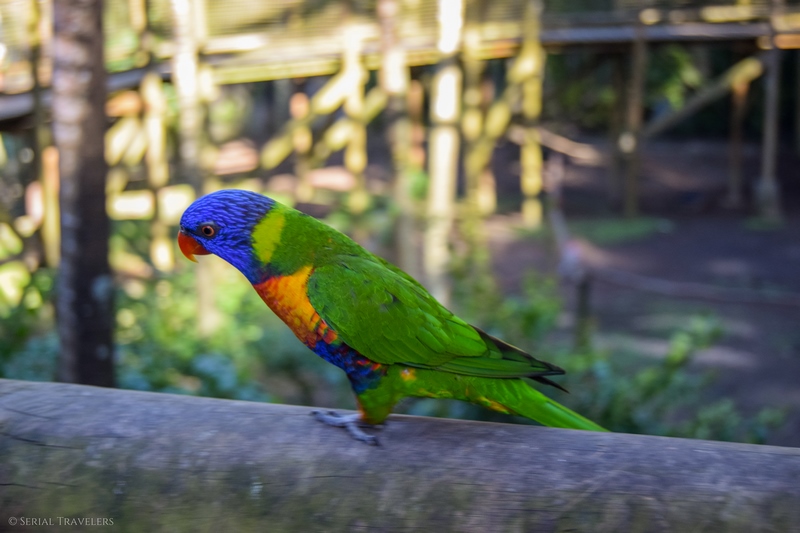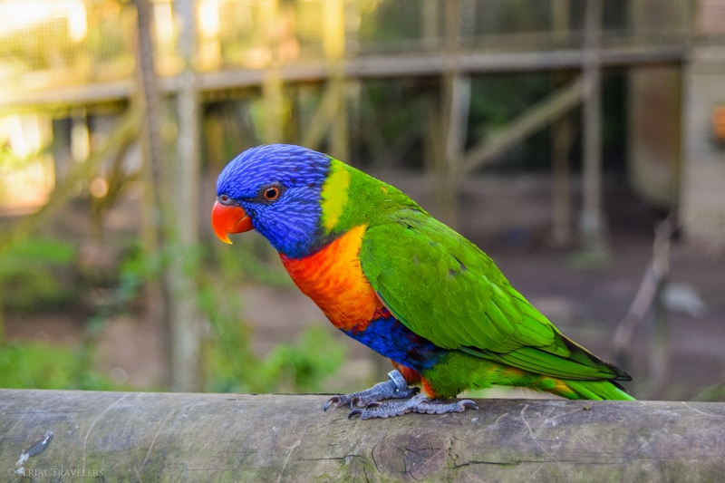 Est-ce que vous vous souvenez des espèces de perroquets multicolores que nous avions rencontré à Airlie Beach en Australie ? Dans les régions côtières s’étendant du Queensland au South Autralia, on retrouve une espèce particulièrement colorée et bruyante : le loriquet à tête bleue, dont le loriquet arc-en-ciel est une sous-espèce. Ces volatils ont la particularité de posséder un plumage reconnaissable entre mille : une tête toute bleue ornée d’un bec orange, avec un plumage vert sur le dos et un ventre variant du jaune à l’orange !