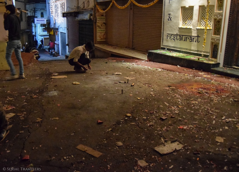 Le jour J à Udaipur, les festivités officielles étaient annoncées pour 20H. De 18H à 20H, les familles se retrouvent dans les maisons puis sortent tous ensemble deux heures plus tard. À 18H, il n’y a effectivement personne dans les rues et c’est une première pour nous en Inde ! On en profite pour arpenter les rues et admirer les illuminations.