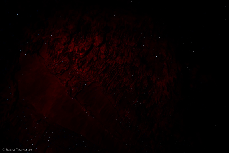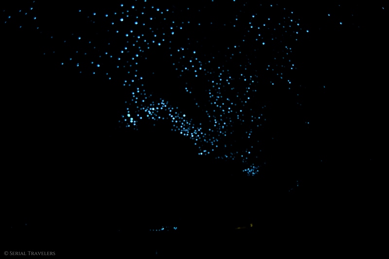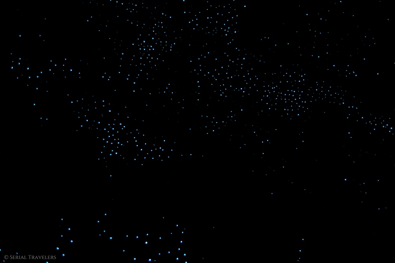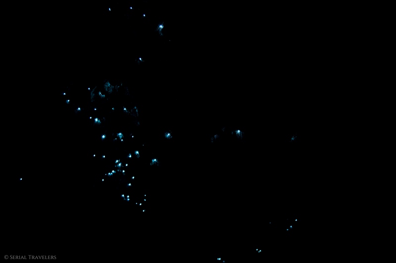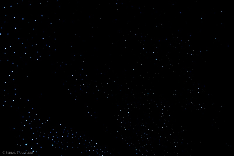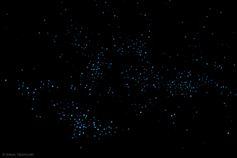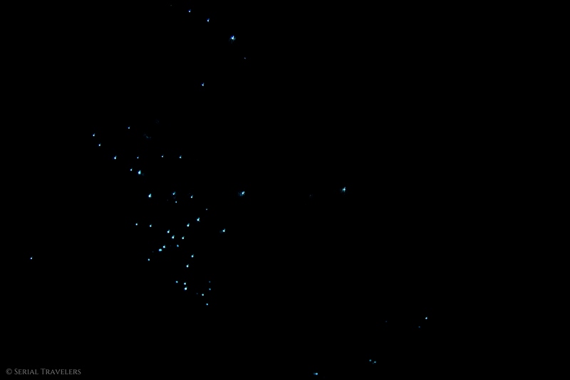Après avoir traversé le cours d’eau, l’obscurité est complète. Nous éteignons nos lampes et apercevons déjà quelques vers luisants en levant la tête. Une dizaine de minutes plus tard, nous atteignons la zone où brillent le plus de vers…