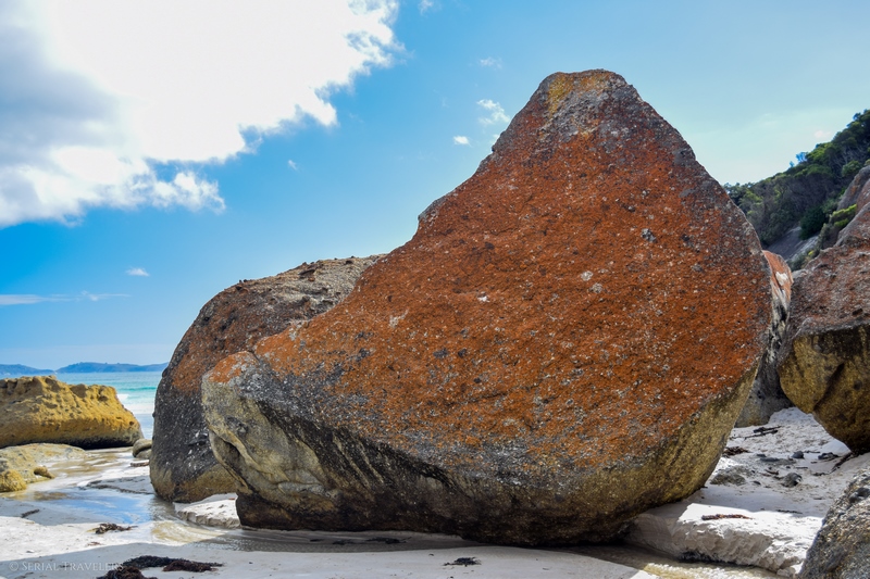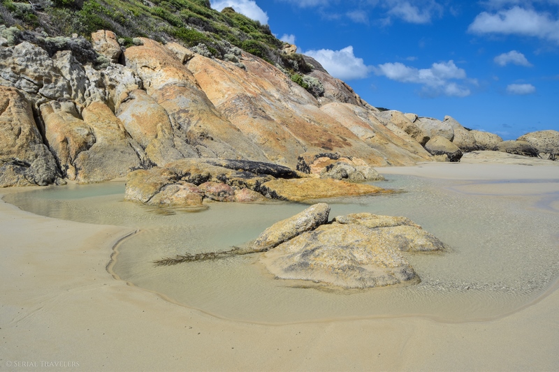 Mais aussi pour le son caractéristique émis par le sable quand on marche sur sa surface ! Et oui, les grains de quartz arrondis composant le sable émettent un grincement particulier lorsque l’on marche dessus, ce qui a laissé son nom à cette plage populaire (squeaky = grinçant) ! L’autre particularité de ce site est la présence d’immenses blocs de granit aux couleurs grises et orangées, créant un labyrinthe naturel, dans lequel petits et grands peuvent s’engouffrer 🙂