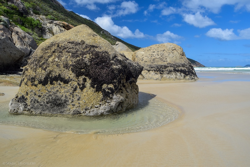 Localisée à proximité directe du campground de Tidal River, la très jolie plage de Norman Beach est entourée par Pillar Point au Nord et Norman Point au Sud et offre aux visiteurs une superbe vue sur le Mont Oberon. La plage est ornée de plusieurs énormes rochers situés aux pieds du Mont Oberon, sur lesquels on retrouve des tonnes de jolis coquillages violacés, bien accrochés à la roche.