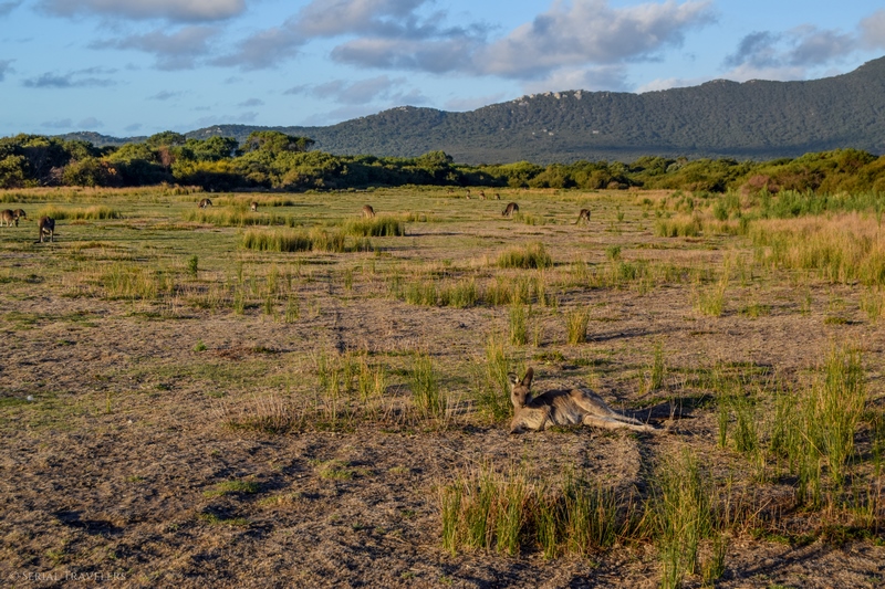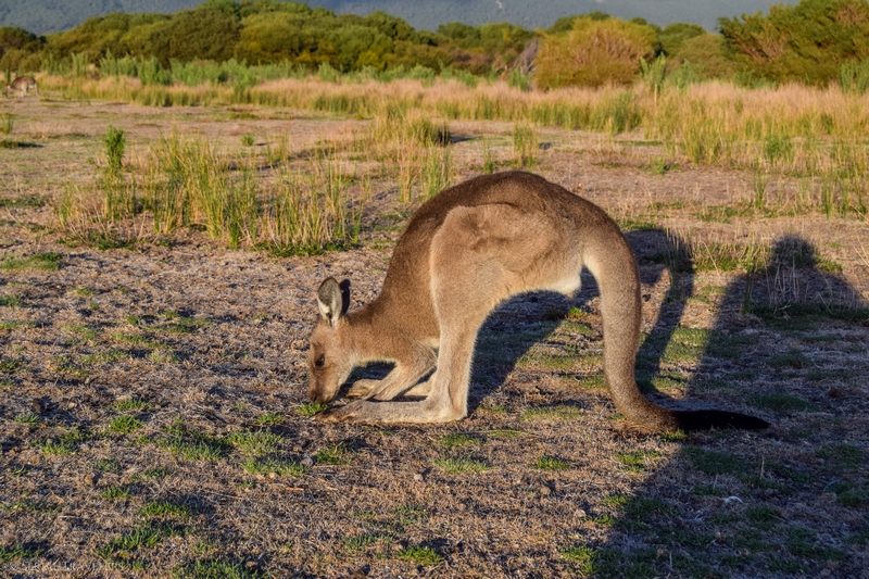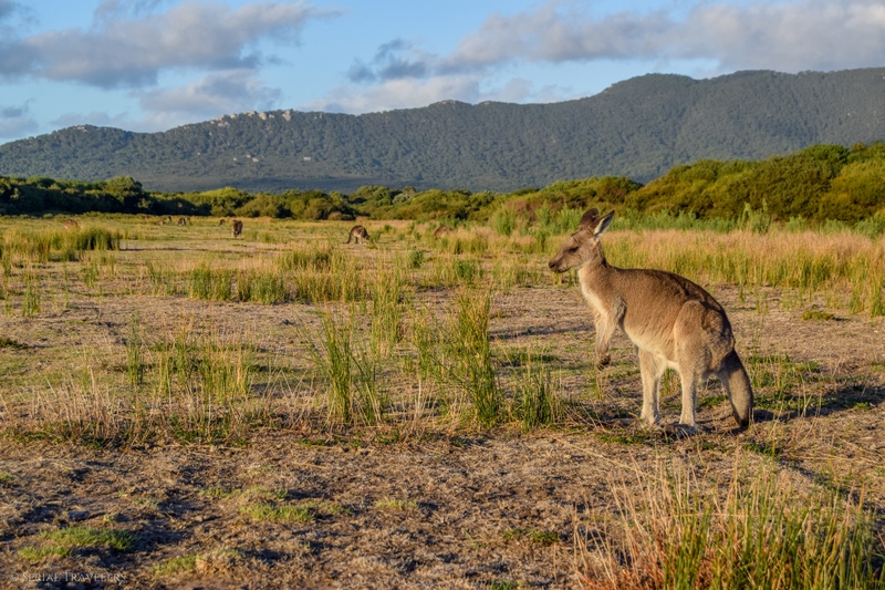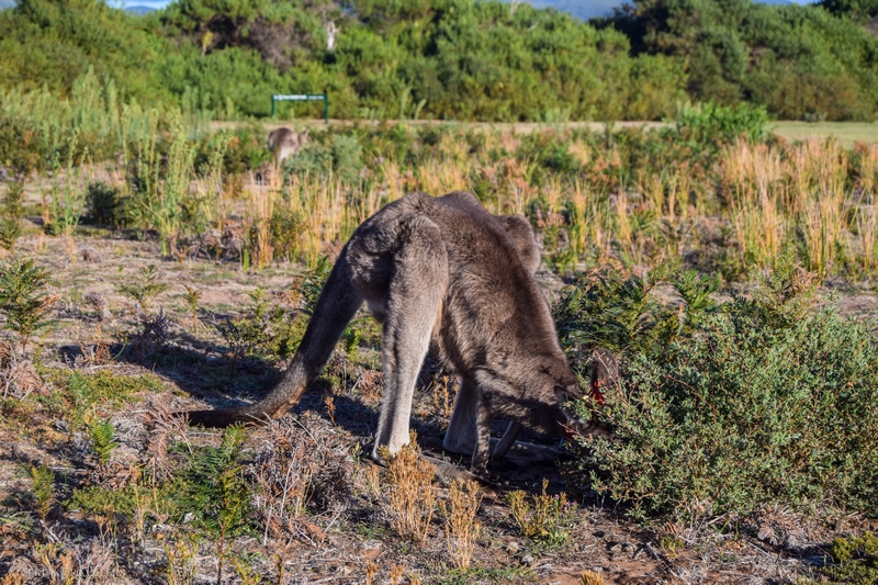 Dernier point d’intérêt de la journée, le Prom Wildlife Walk est une randonnée qui permet d’observer énormément d’animaux endémiques d’Australie (kangourous, émeus, wallabies, wombats etc.) en totale liberté ! Et nous avons bien failli la rater, ce qui aurait été une énorme déception ! Heureusement, nous avons jeté un coup d’œil au blog d’Elodie et Thomas de Planet3w, qui ont parcouru le parc un an avant nous et ont découvert ce spot exceptionnel. Cette courte randonnée située au Nord-Ouest du parc nous amène à travers des prairies d’herbes hautes où paissent une colonie de nombreux kangourous, sauvages, mais peu farouches !