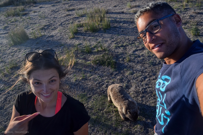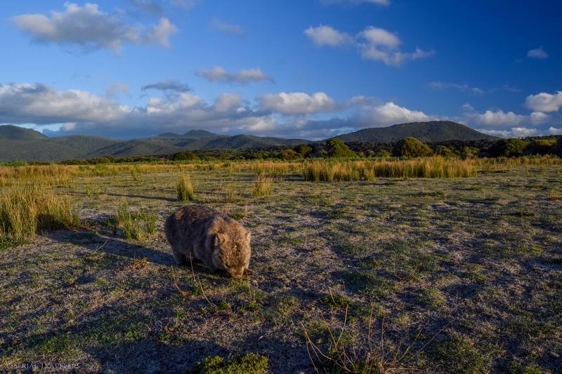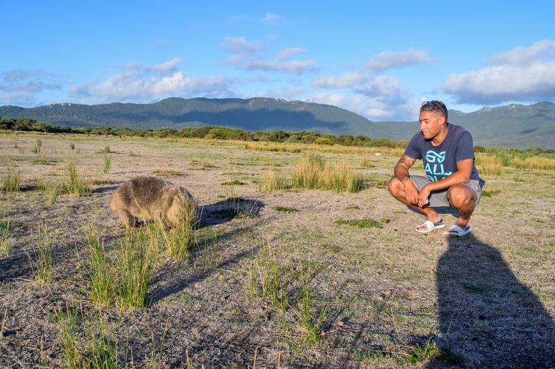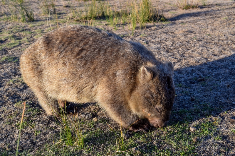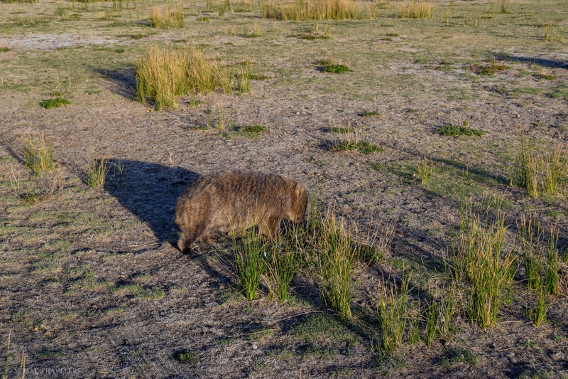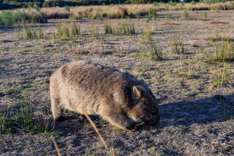 Nous continuerons notre marche à travers les prairies, observant deux émeus de très loin et tomberont finalement sur un wombat, le premier du genre à croiser notre chemin ! Tout comme de nombreux animaux australiens, le wombat est un mammifère marsupial et ressemble à un petit ours brun, au corps massif et à la fourrure dense. Celui-là restera de marbre malgré notre présence, et continuera sa besogne en broutant les quelques brins d’herbe verte restants.