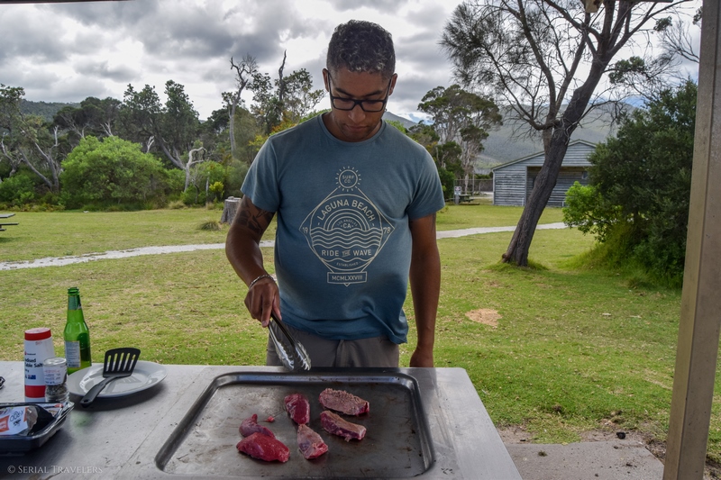 De retour à Tidal River, nous utiliserons les installations du campground, qui compte 12 tables de pique-nique ainsi que des… Barbecues à gaz, gratuits ! Et oui, nous avons testé les fameux barbecues gratuits australiens (surnommés affectueusement barbies) en cuisinant des steaks de kangourou, que l’on trouve dans n’importe quel supermarché ici.